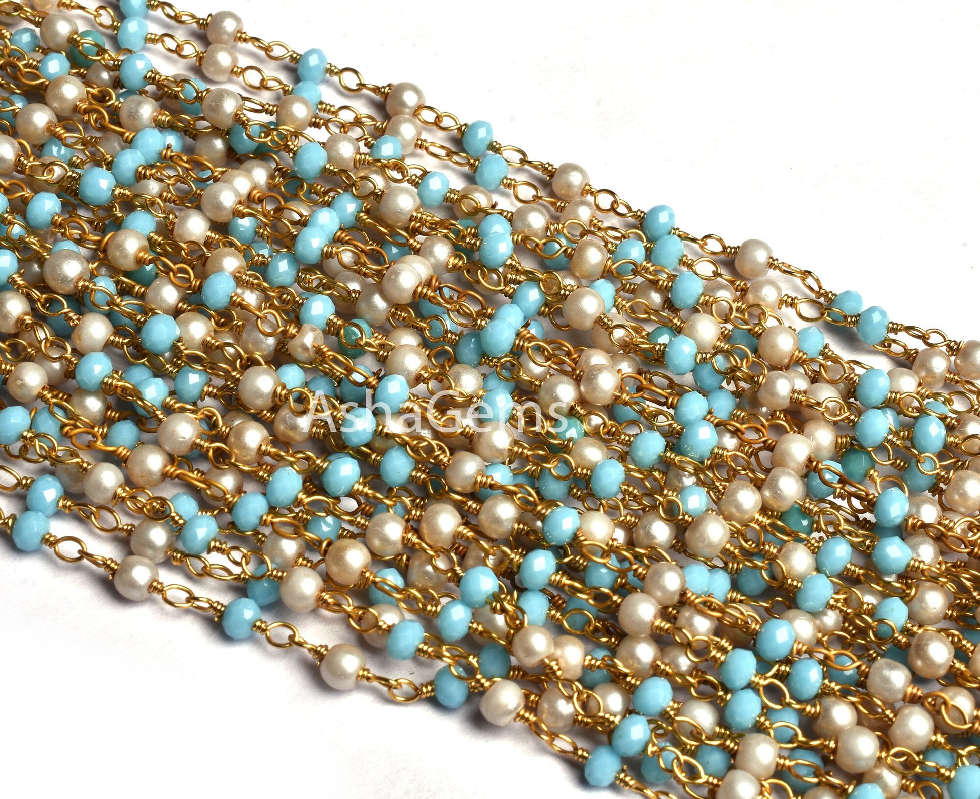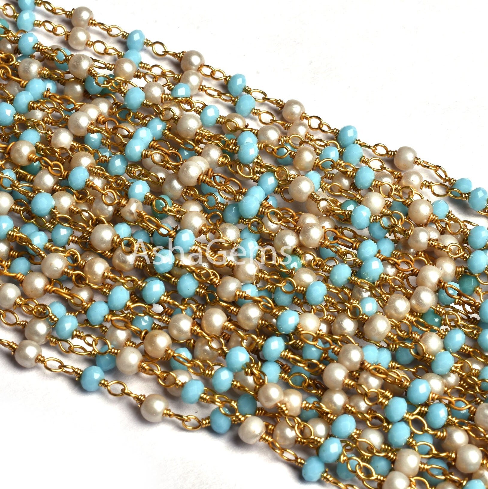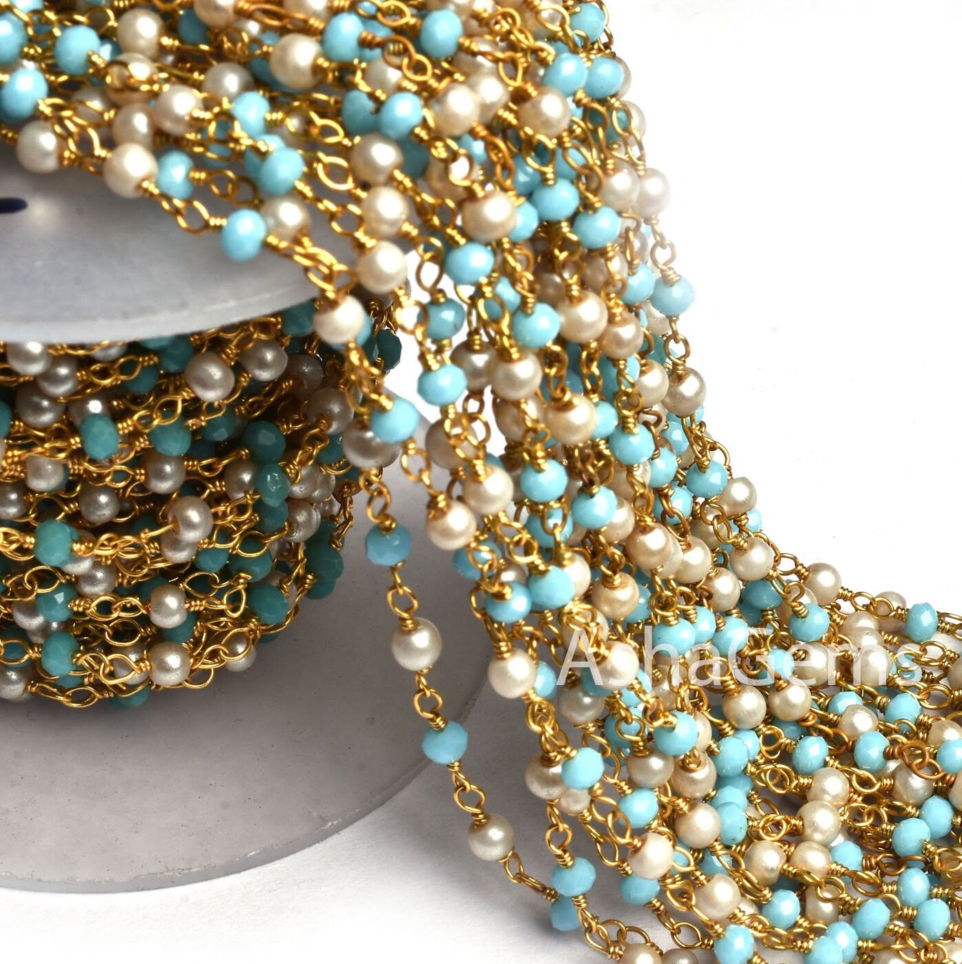 1,10,50 Foot Bulk Roll Rosary Chain Pearl Blue Turquoise Hydro Faceted Rondelle Beads Chain Gold Plated wire Multi Color Beaded Chain Rosary