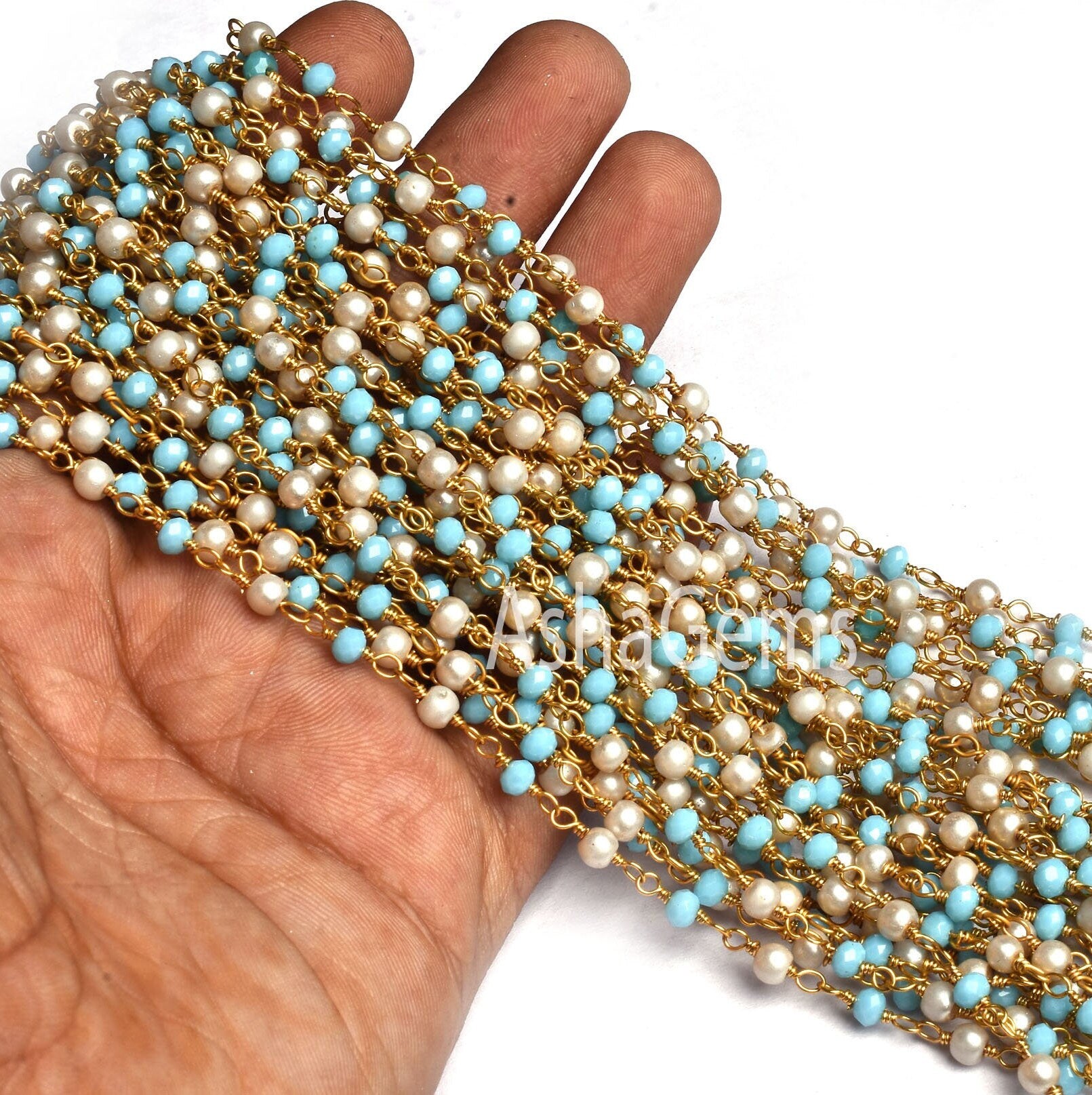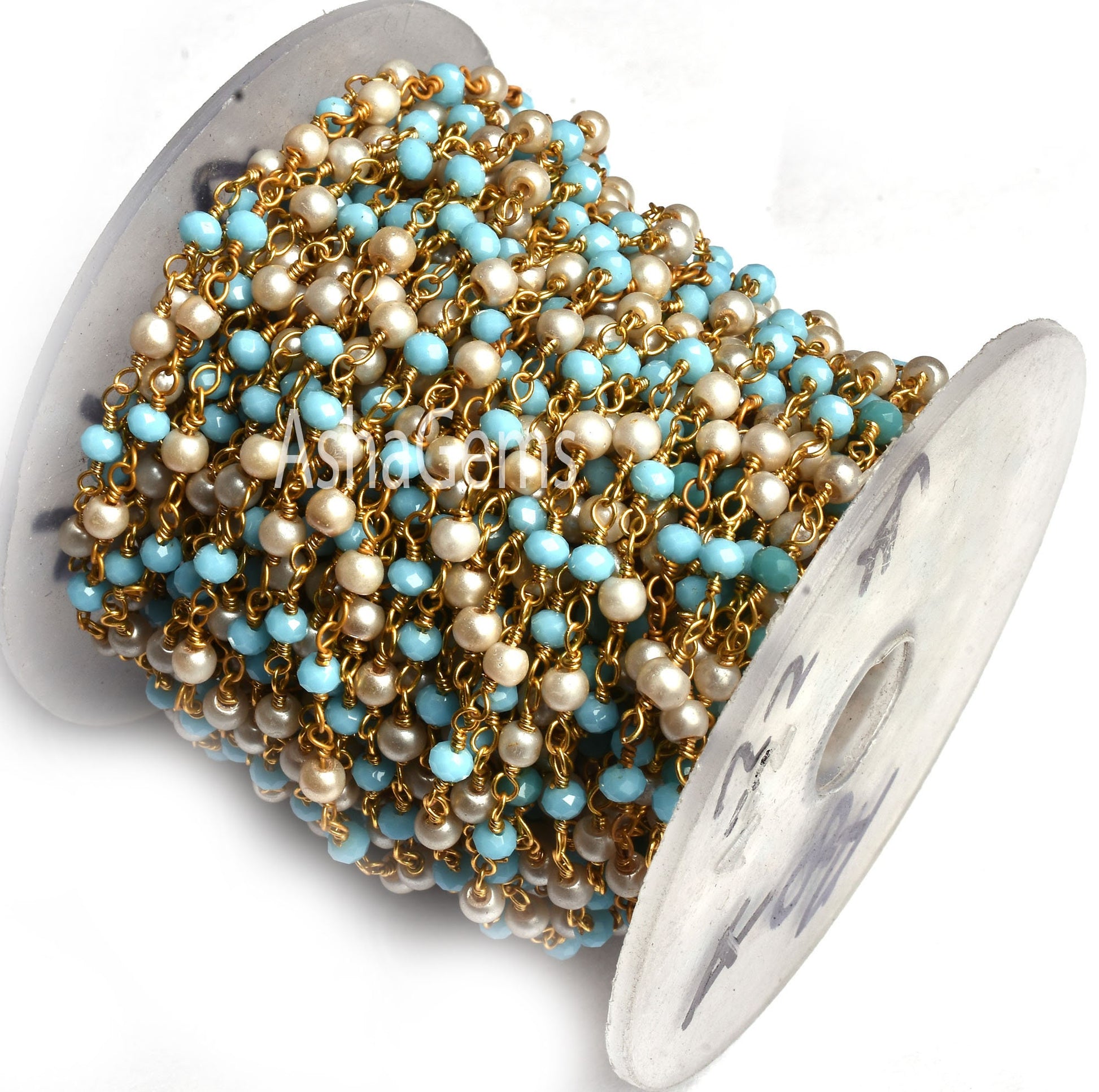 1,5,10,50 Ft Bulk Roll Rosary Chain Pearl,Blue Turquoise Hydro Faceted Rondelle Beads Chain Multi Color Gold Plated Wire Beaded Chain Rosary