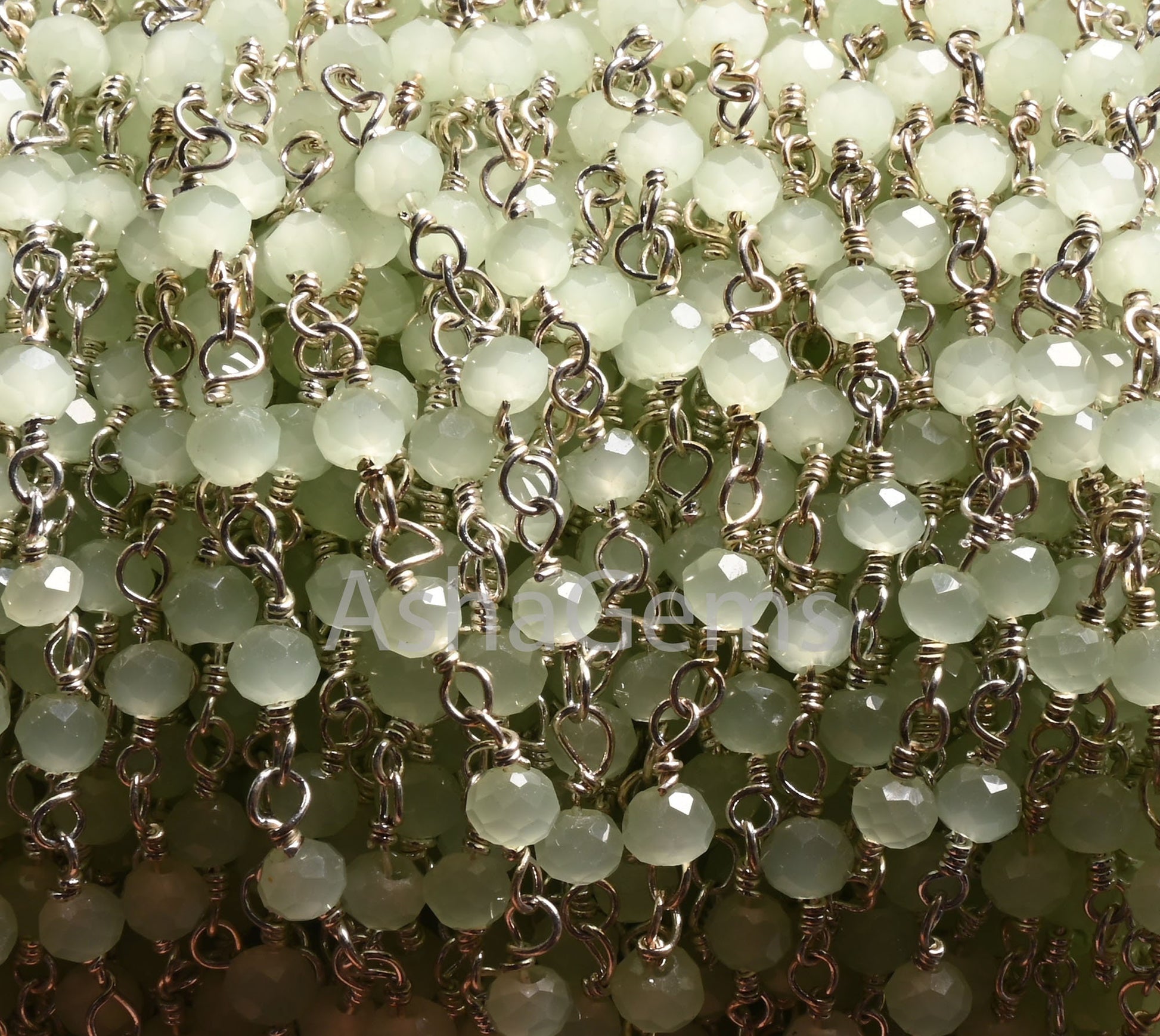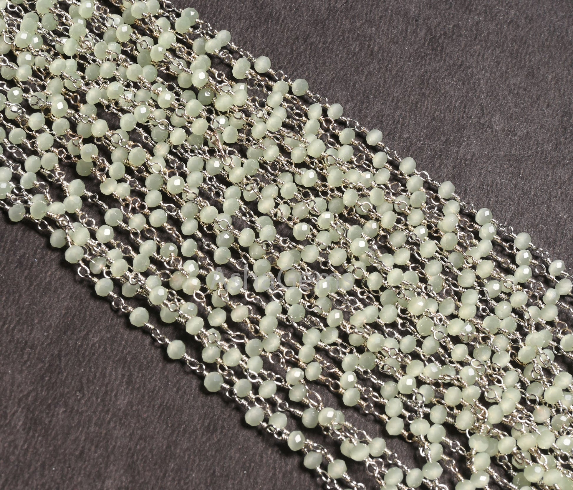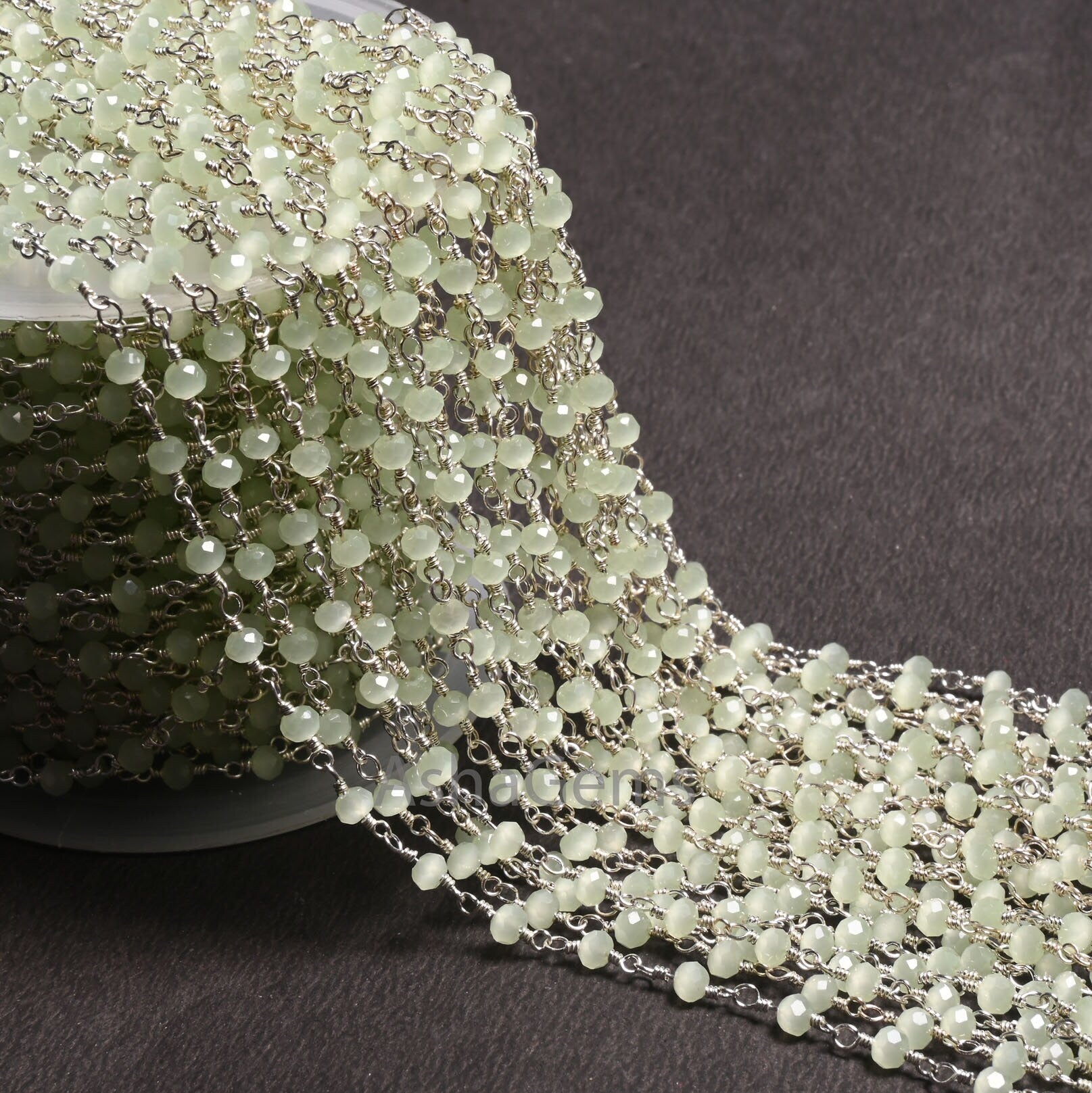 1,3,10,50 Feet Bulk Roll, Green Prehnite Hydro Faceted Beads Rosary Chain 3.5mm Silver Plated Wire wrapped Beaded Chain Rosary Jewelry Craft