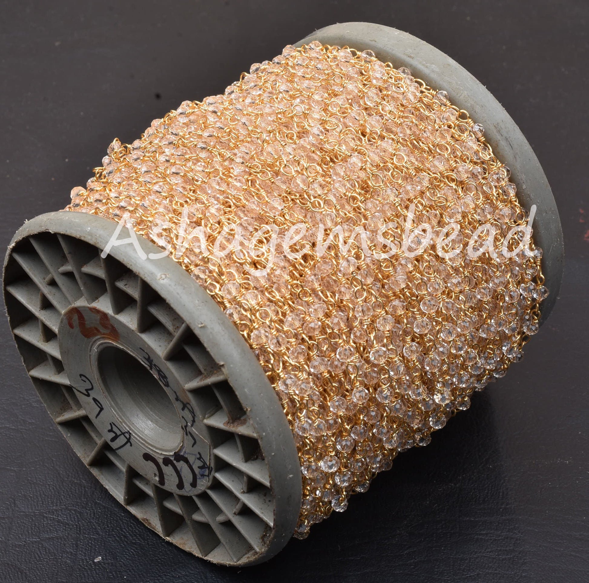 1,3,5,10,50 Ft,Clear Crystal Quartz Hydro Faceted Rondelle Beads Rosary Chain,3mm,Gold Plated Wire,Beaded Chain,Finding,Jewelry Making,Craft