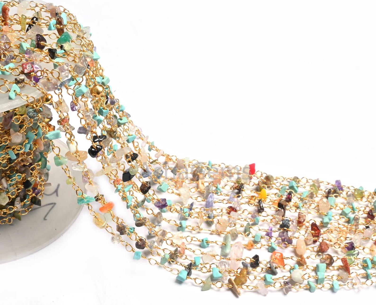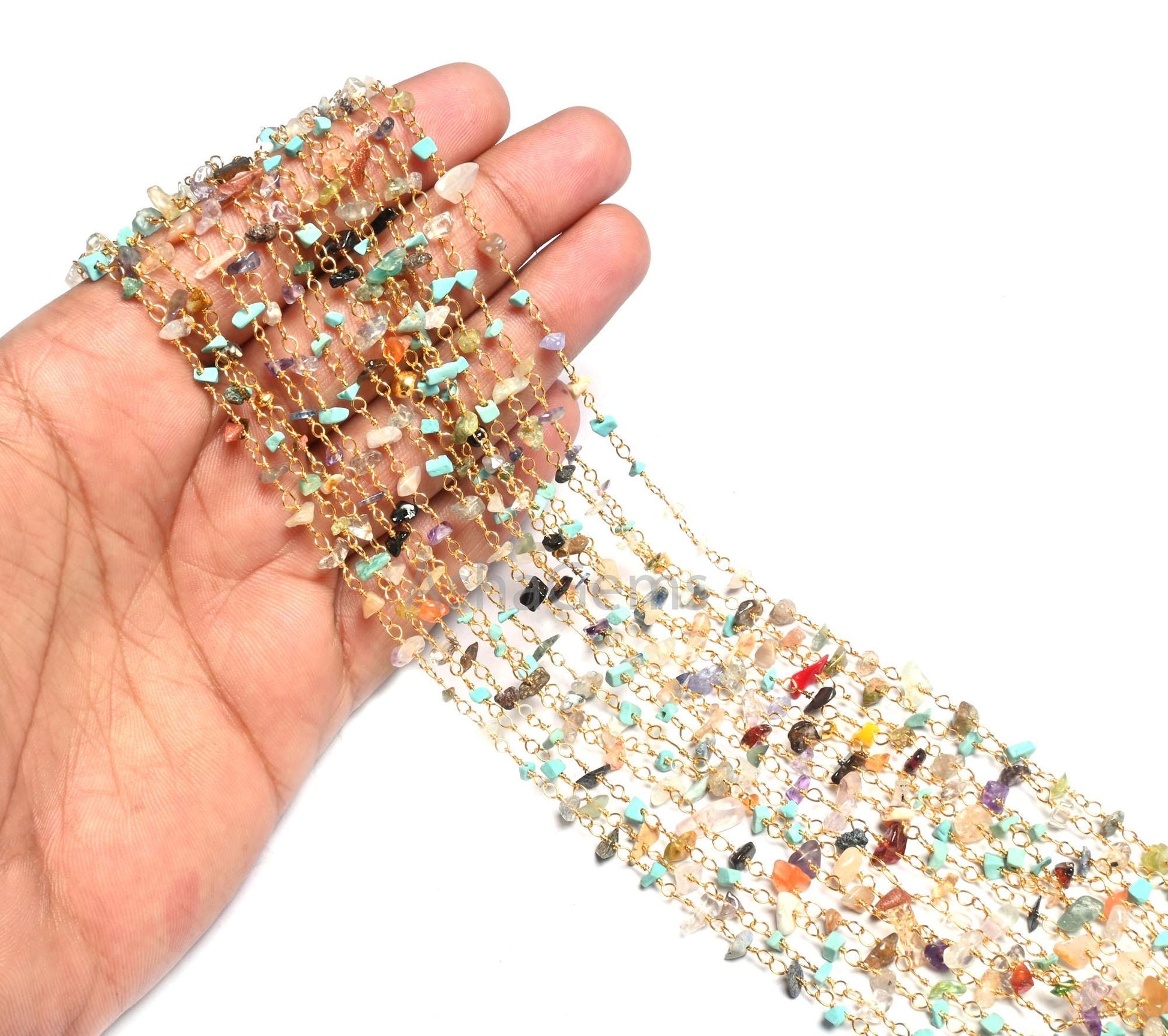 1,3,5,10 Feet Chain Natural Gemstone Multi Color Beads Rosary Chain Gold Plating Wire Disco Uncut Chip Beaded Rosary Chains Finding Jewelry