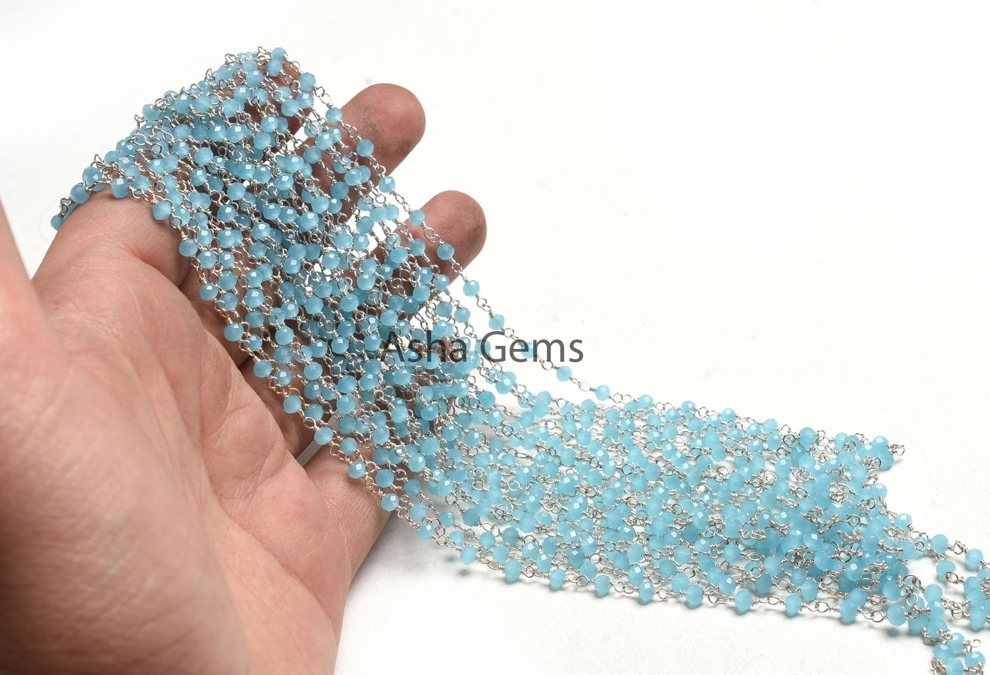 1,5,10,50Feet Chain Blue Milky Aqua Chalcedony Hydro Beads Rosary Chain Faceted Rondelle Silver Plated Wire Bulk Roll Findings Beaded Chains