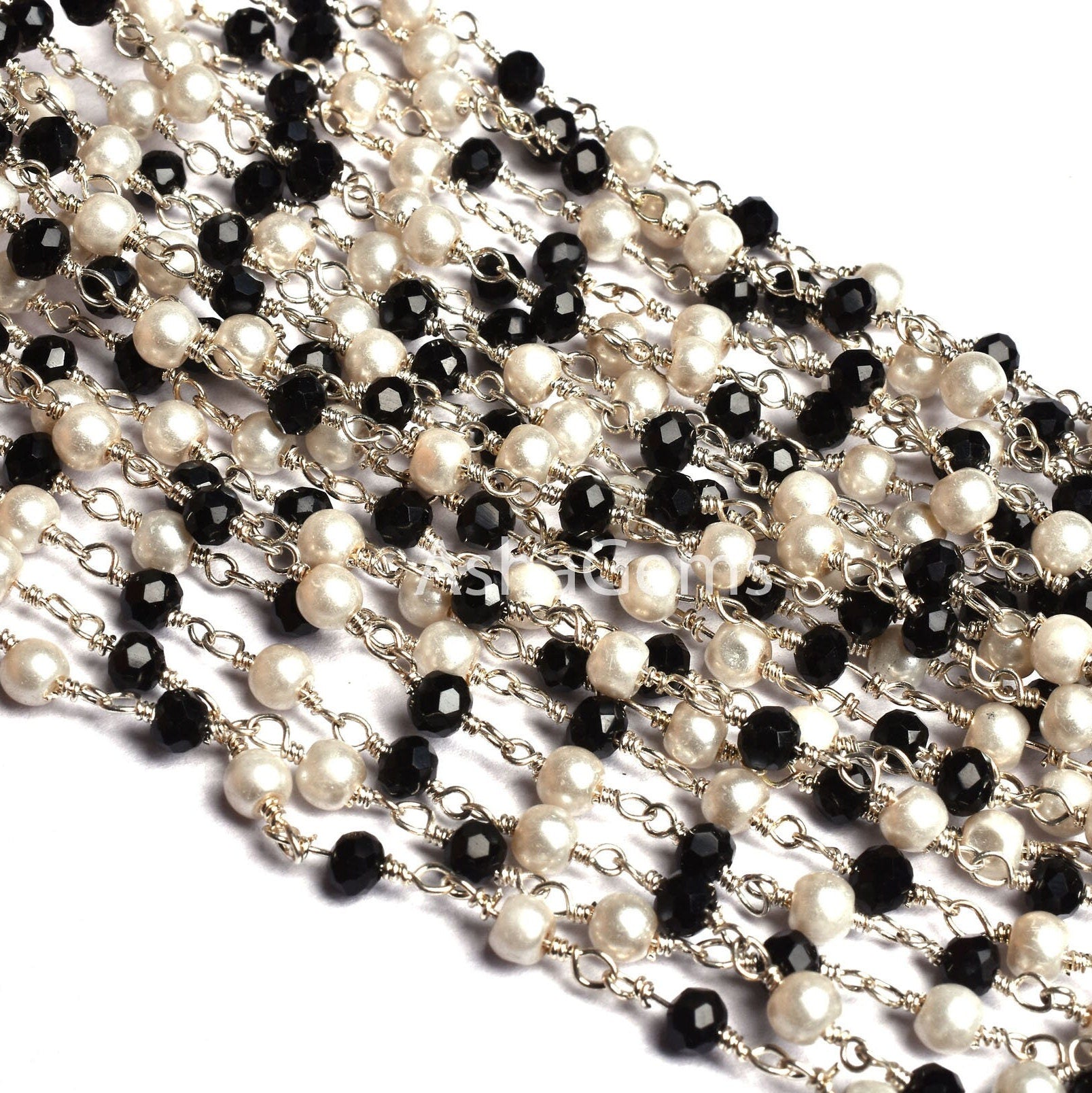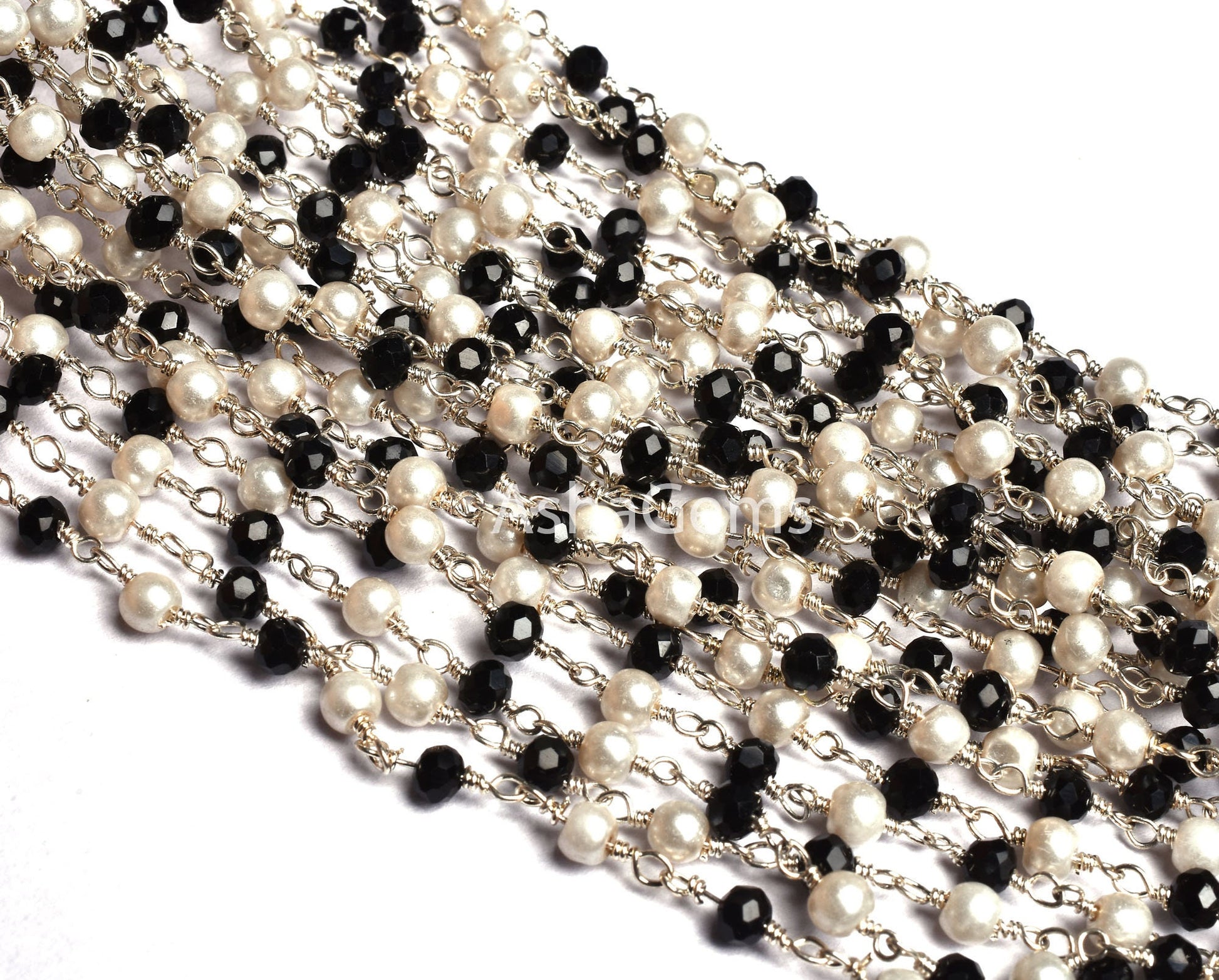 3,5,10,25,50 Feet Pearl Black Onyx Hydro Beads Rosary Chain Silver Plated Chain Faceted Rondelle Beads Rosary Chain Jewelry Making Chain DIY