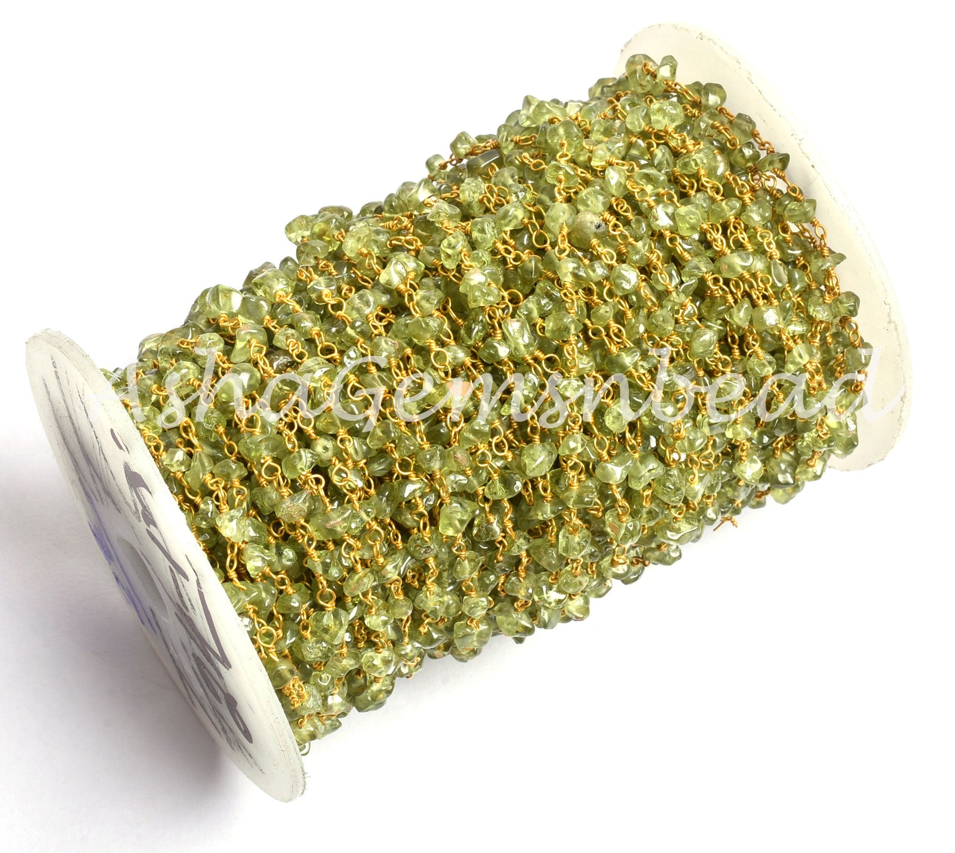 3,5,10,25 Feet Chain, Natural Green Peridot Uncut Chip Beads rosary Chain Gold Plated Wire Bulk Roll Smooth Gemstone Beaded Rosary Chain