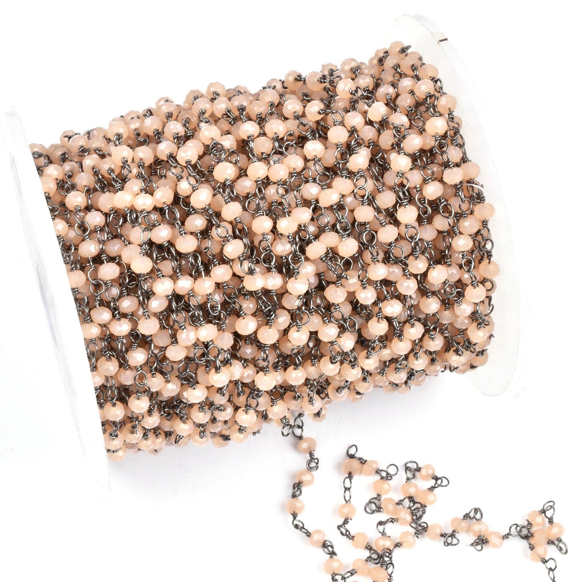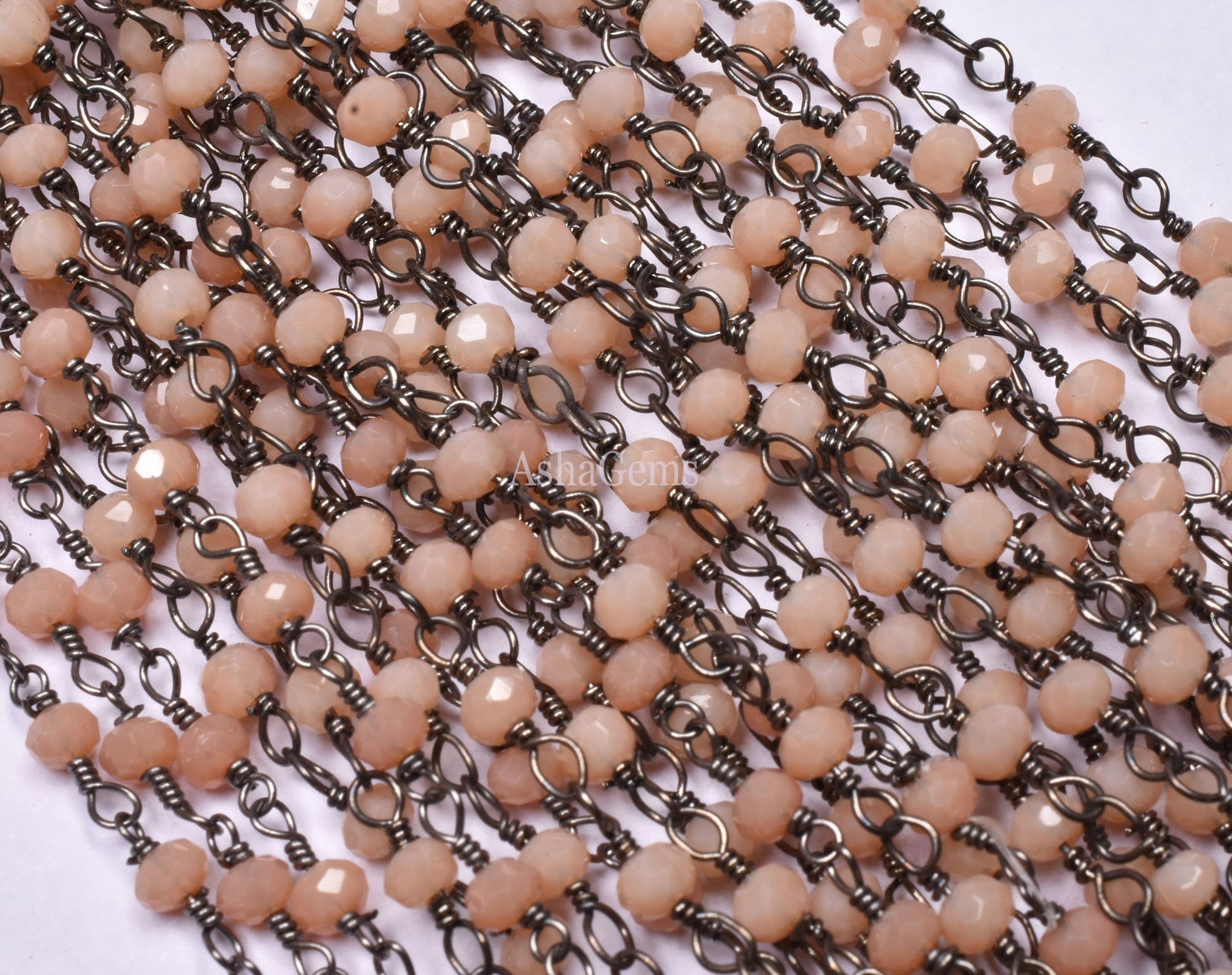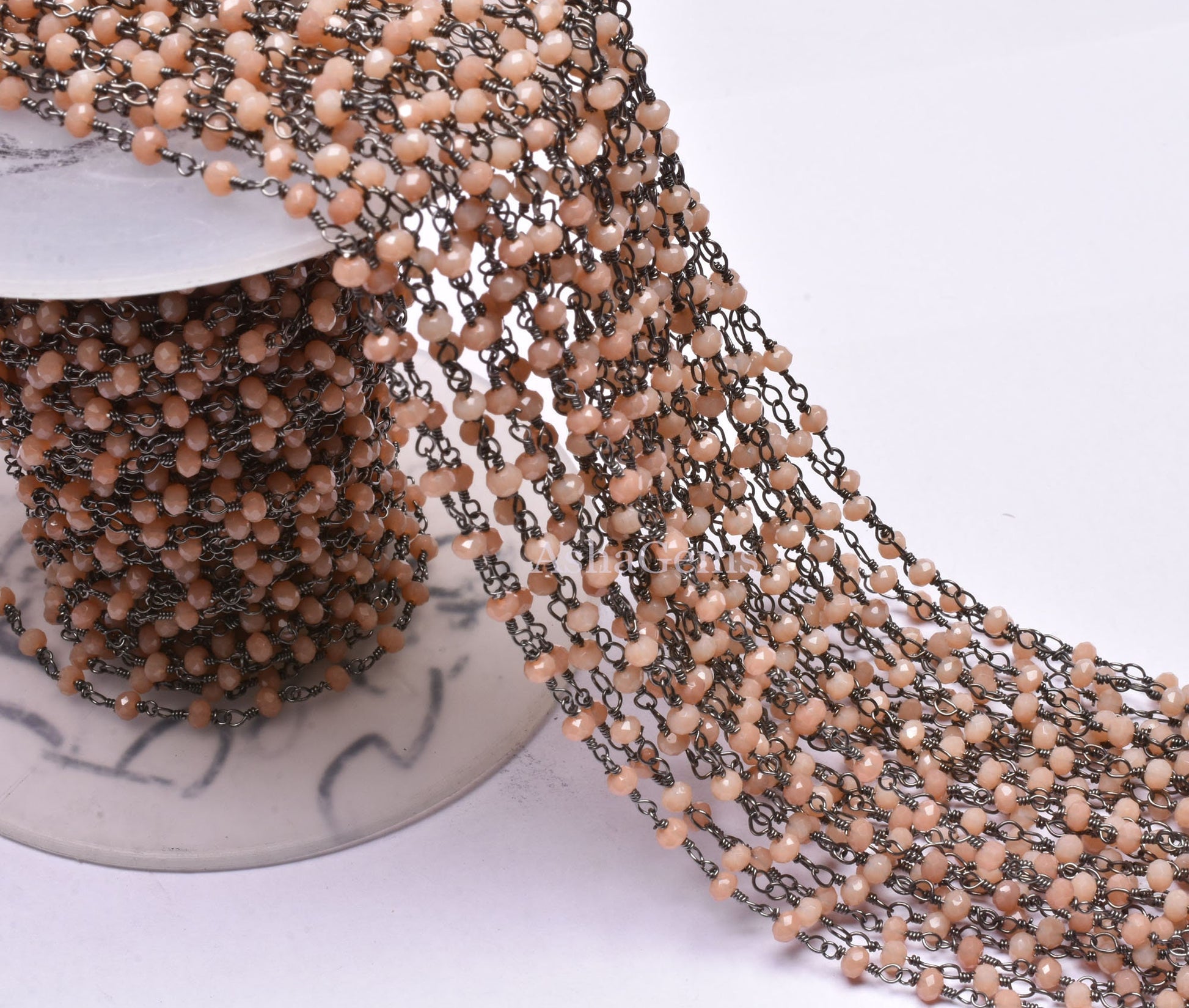 3,5,10,25 Foot,Peach Moonstone Hydro Rondelle Faceted Beaded Rosary Chain Black Metal Plated Wire,Jewelry Making,Finding,3-3.5mm,Bulk Chain