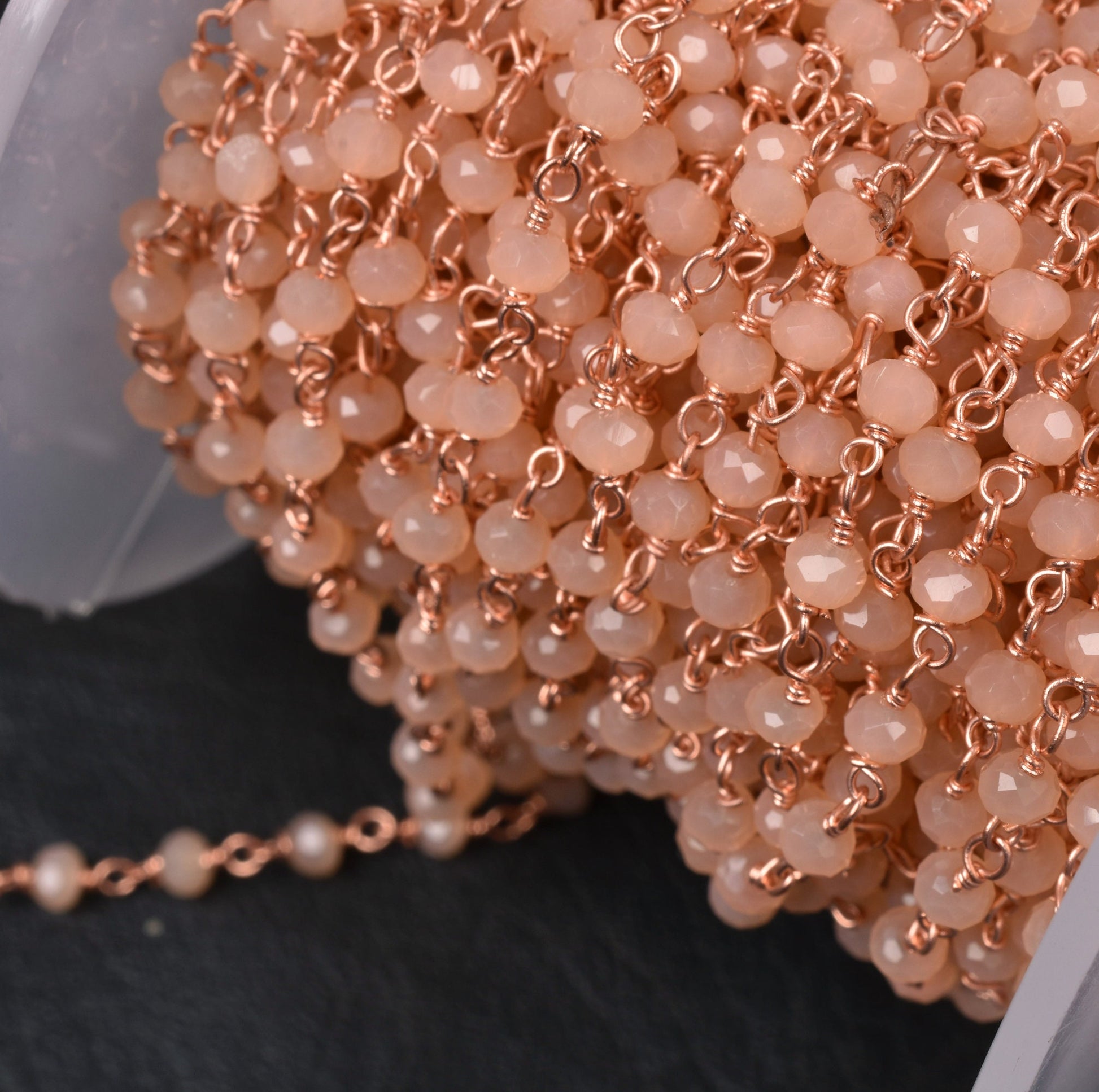 3,5,10,25 Ft,Peach Moonstone Hydro Faceted Rondelle Beaded Rosary Chain Rose Gold Plated,Jewelry Making,Finding,Wire Wrapped Chain,3-3.5 mm