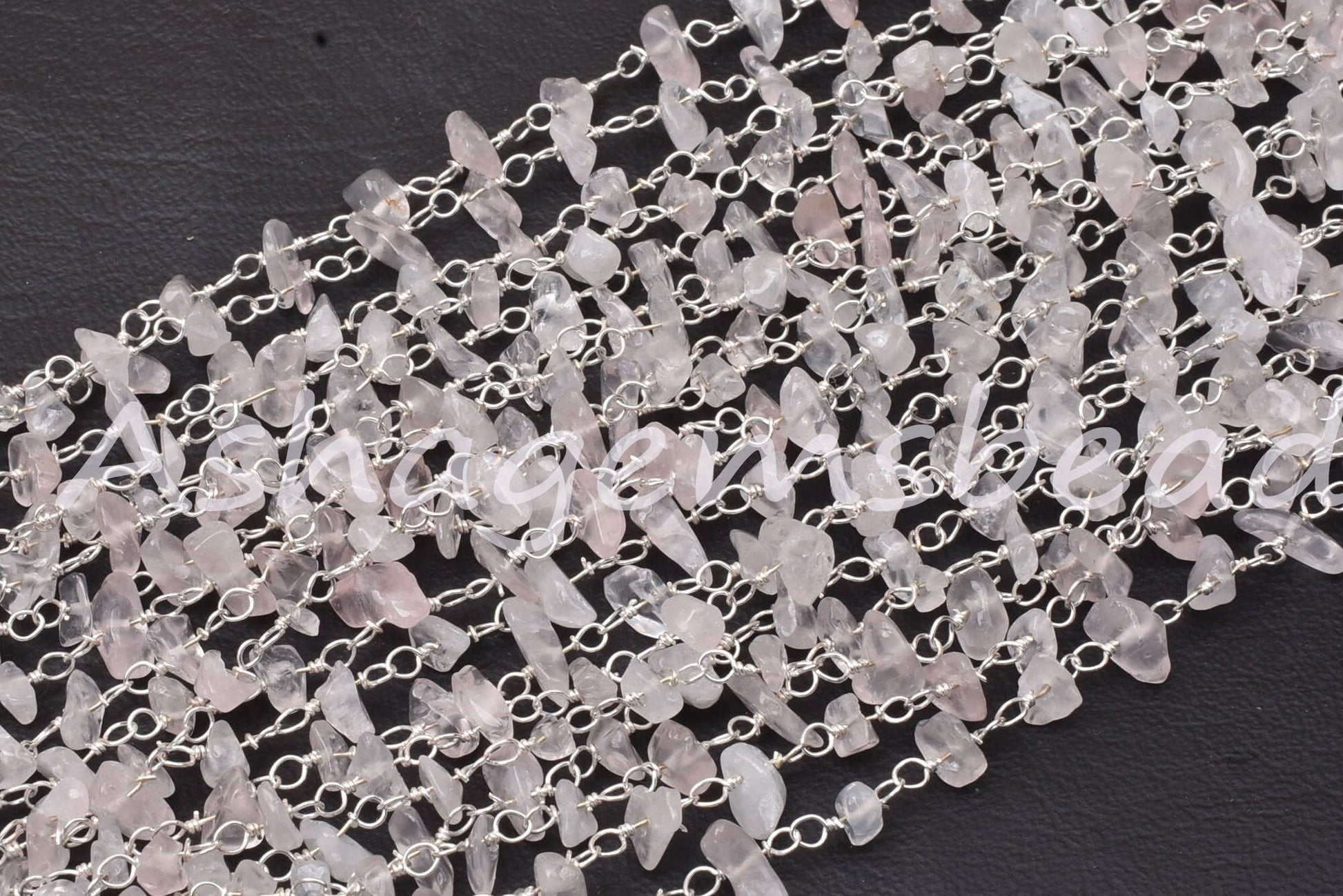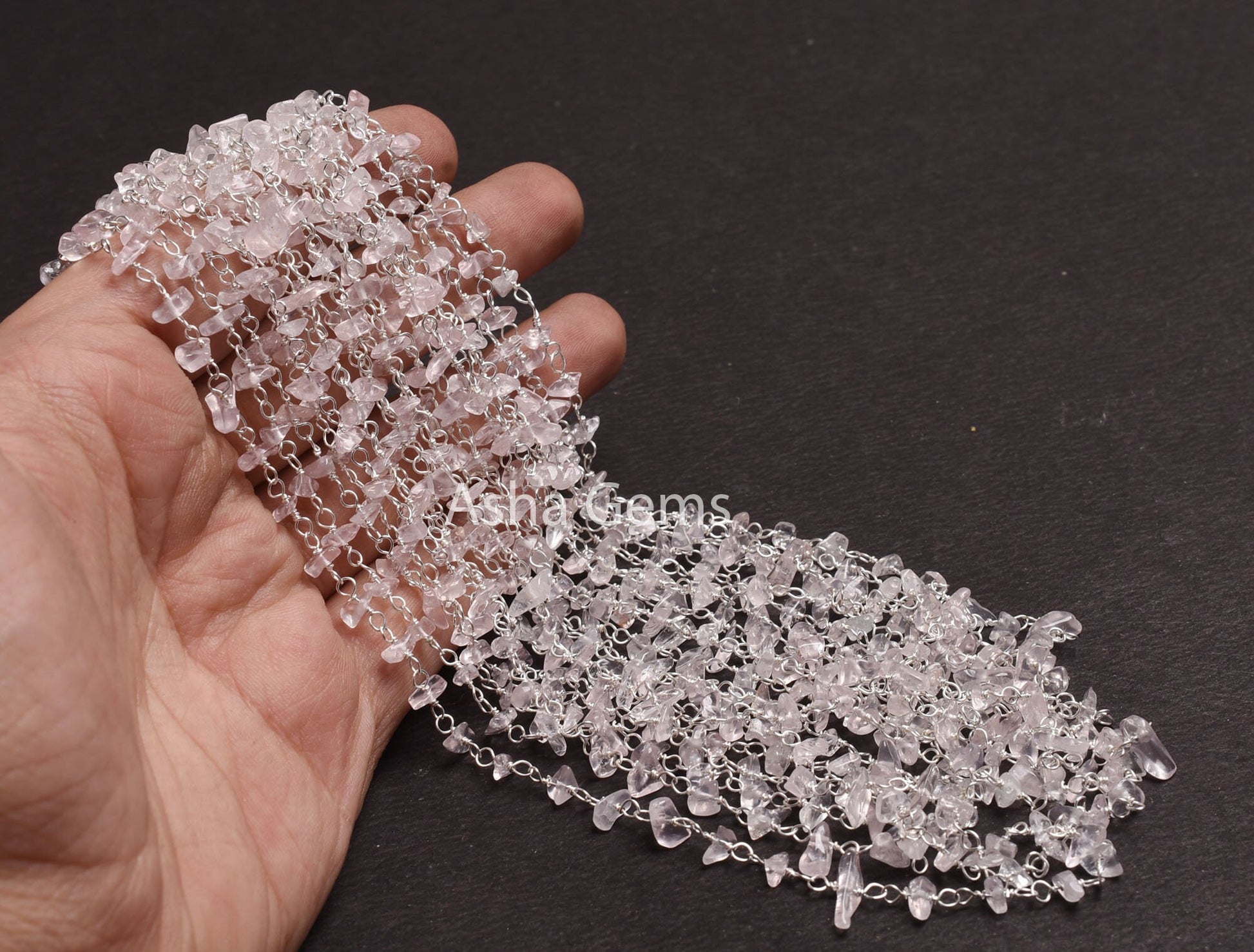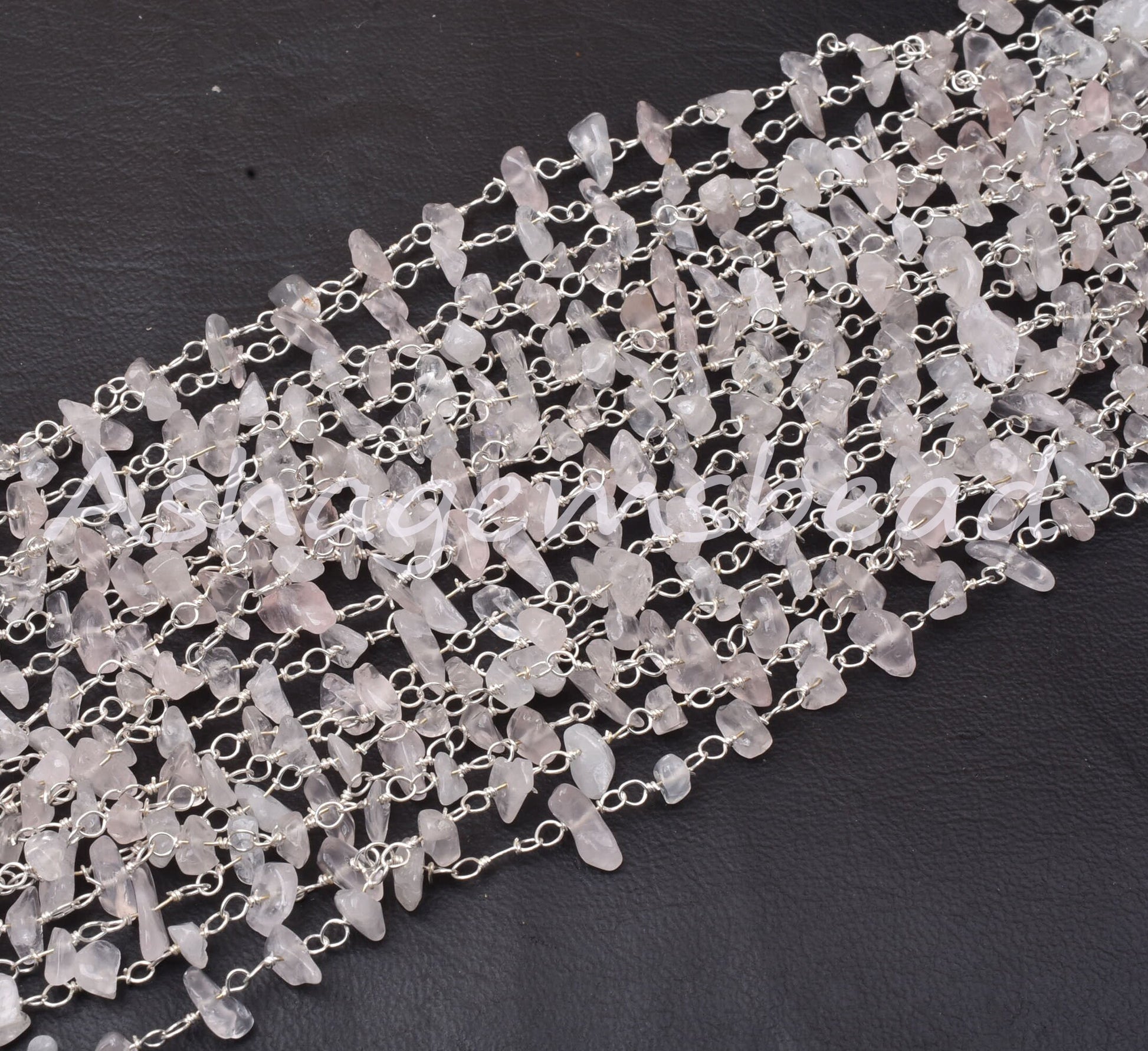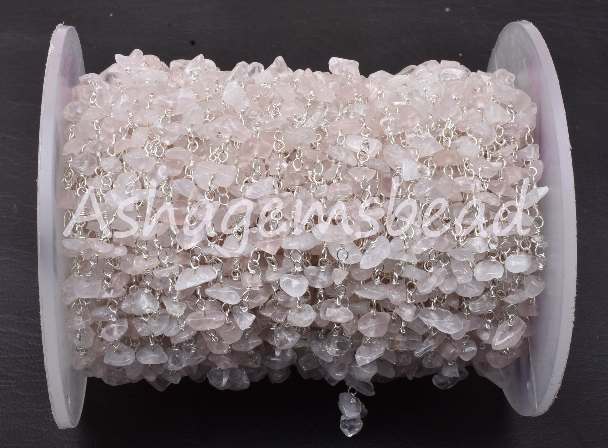 3,5,10 Feet Natural Rose Quartz Uncut Uncut Rosary Chain, Pink rose Quartz Smooth Beads Chain, Silver Plated Chain, Finding, Wholesale Chain