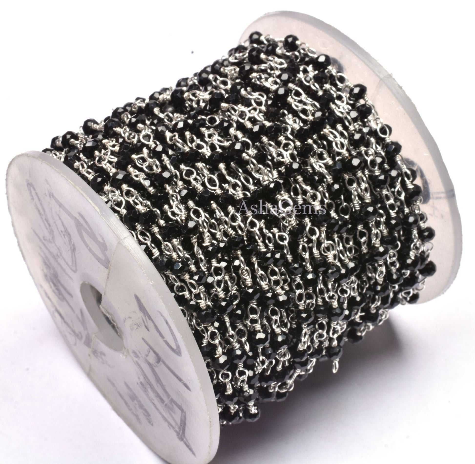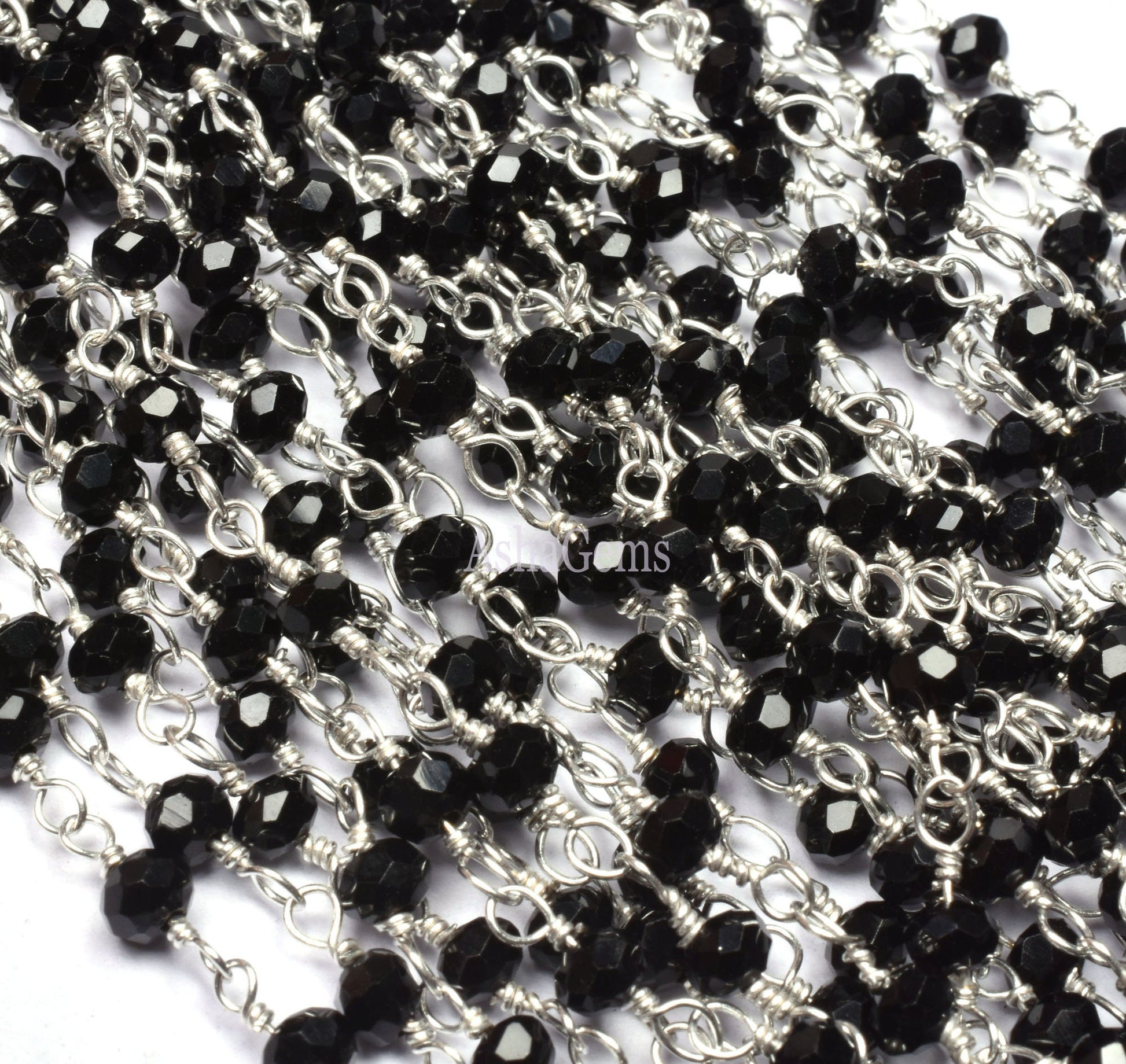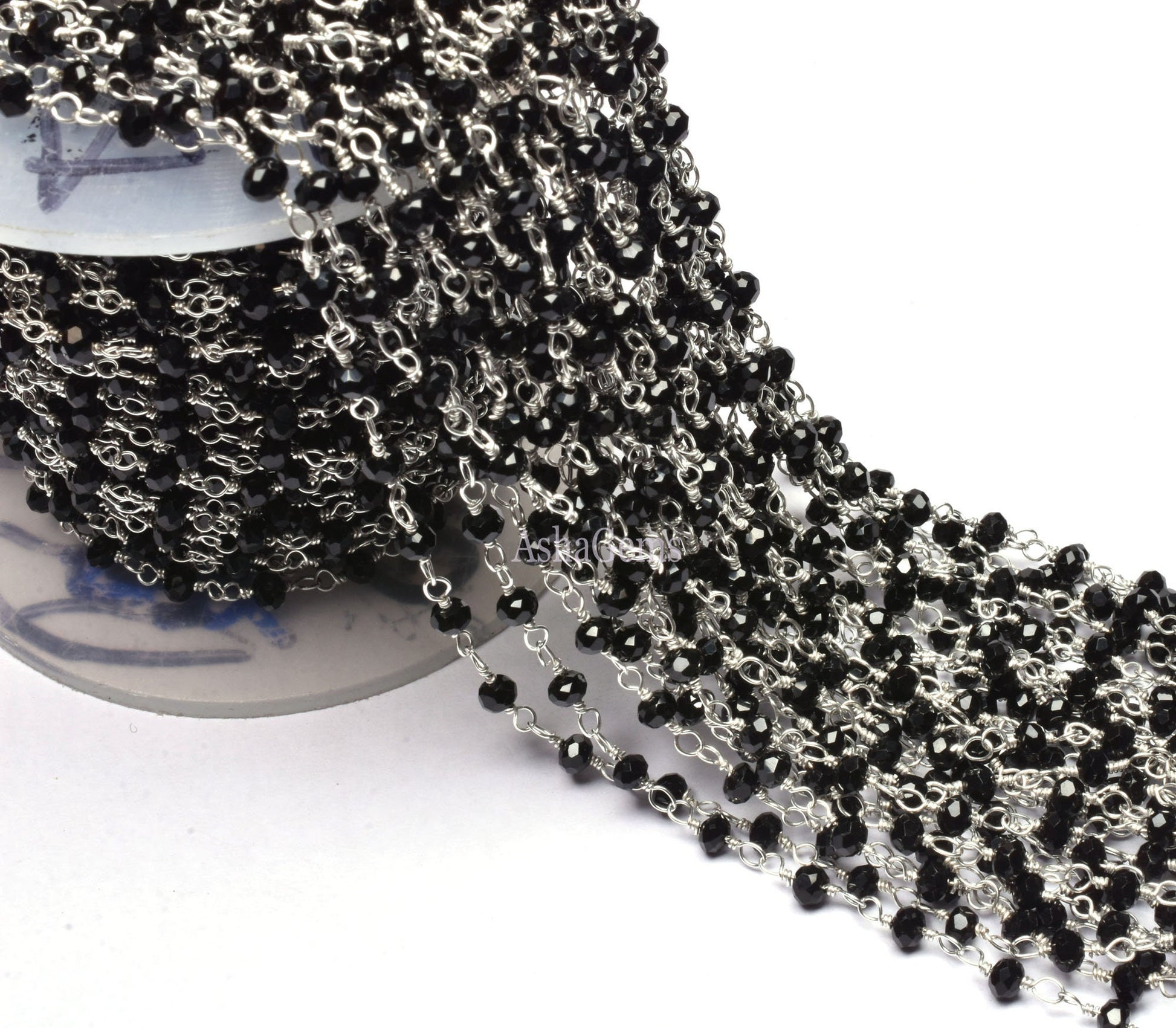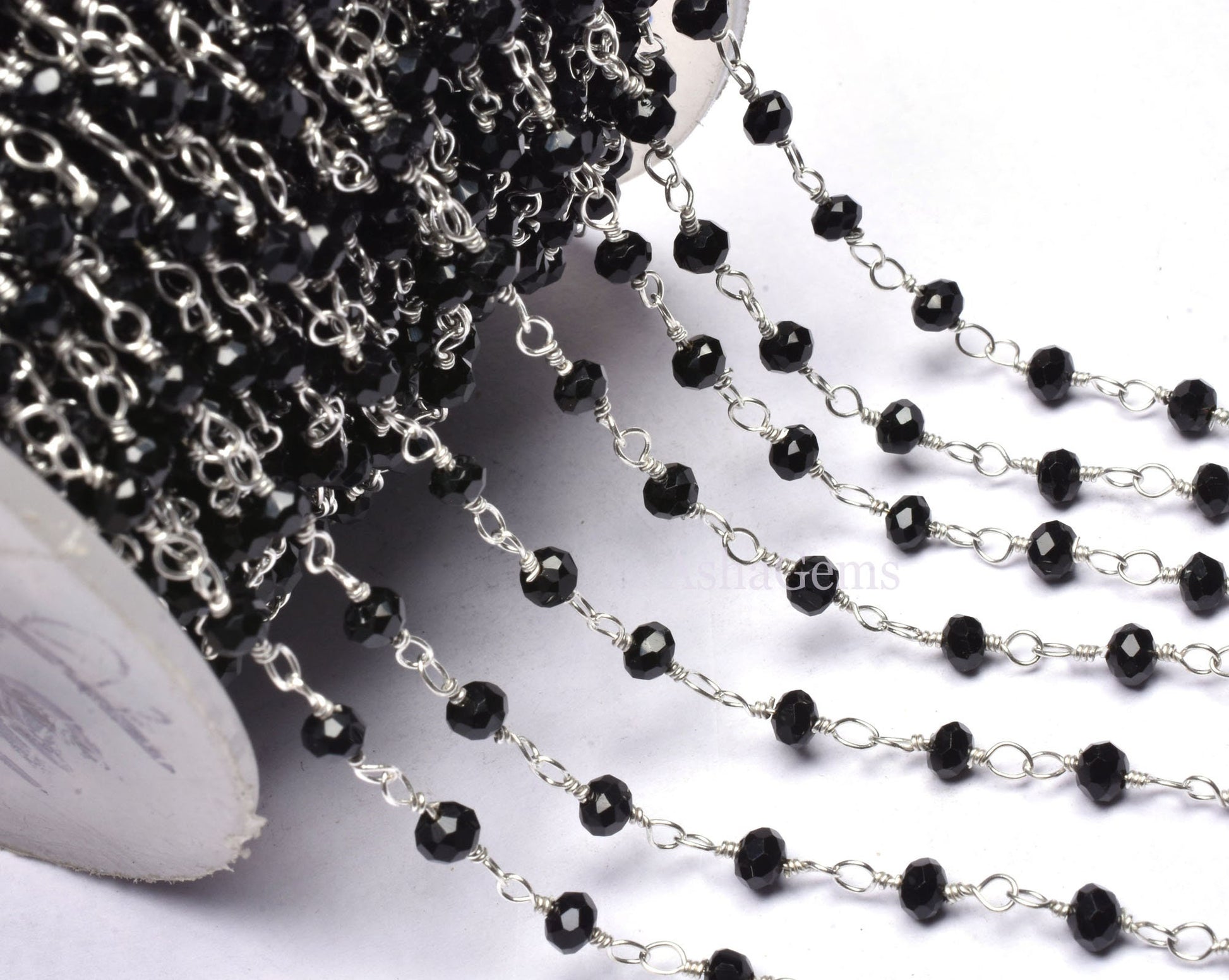 AAA Quality Black Onyx Hydro Micro Cut Rondelle Beads Rosary Chain 3mm, Silver Plated Wire Handmade Chain By Foot For Jewelry Necklace Craft