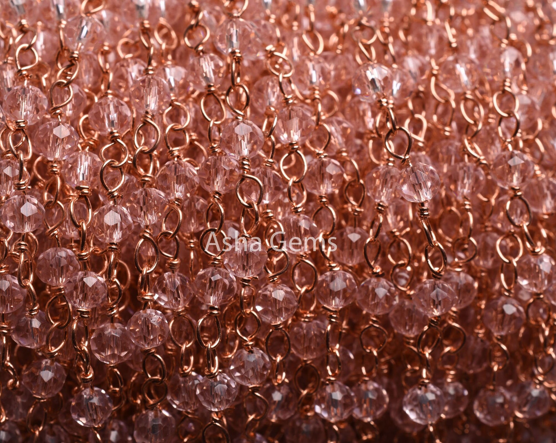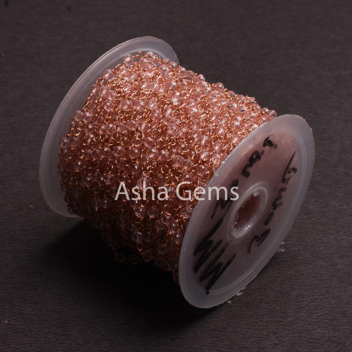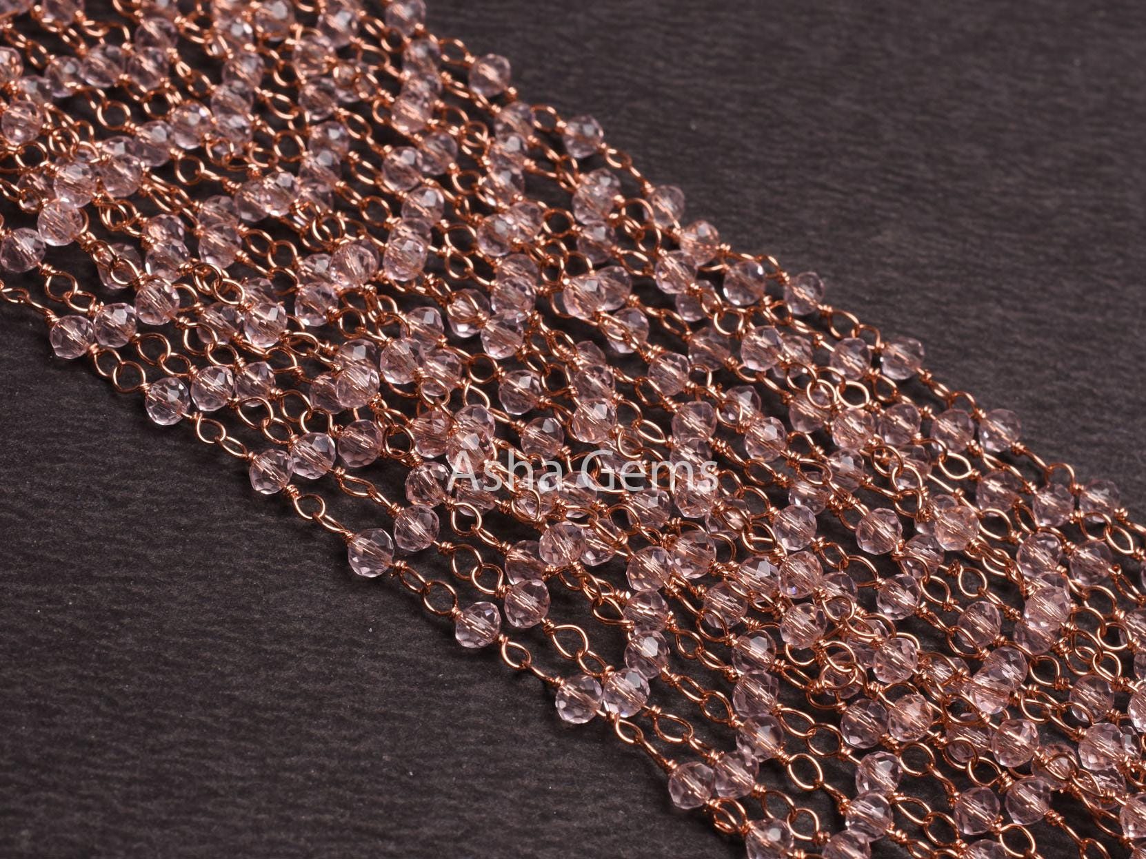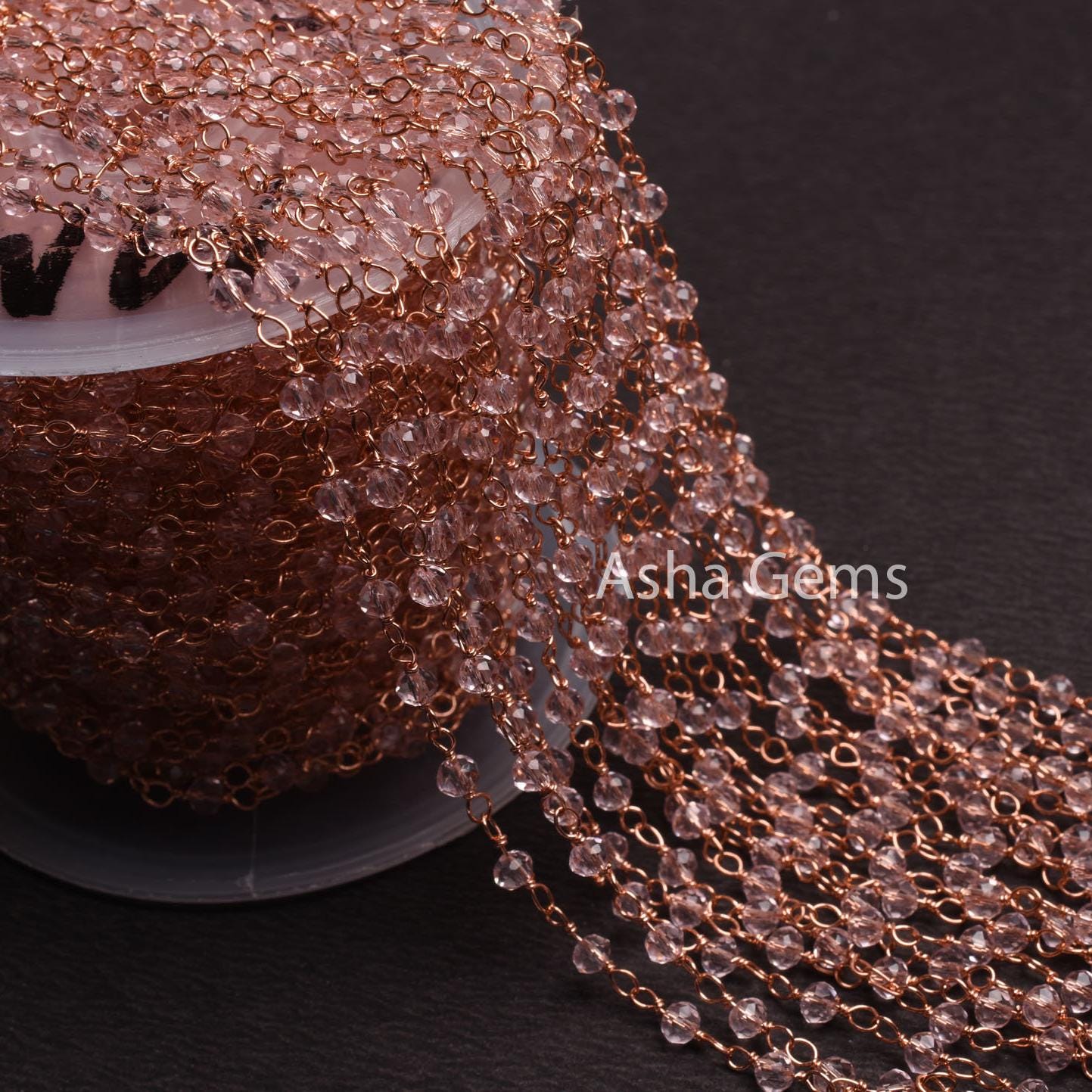 Beautiful Light Pink Quartz Hydro Faceted Rondelle Beads Rosary Chain Rose Gold Plated Copper Wire Wrap handmade Beaded Chain Jewelry Making