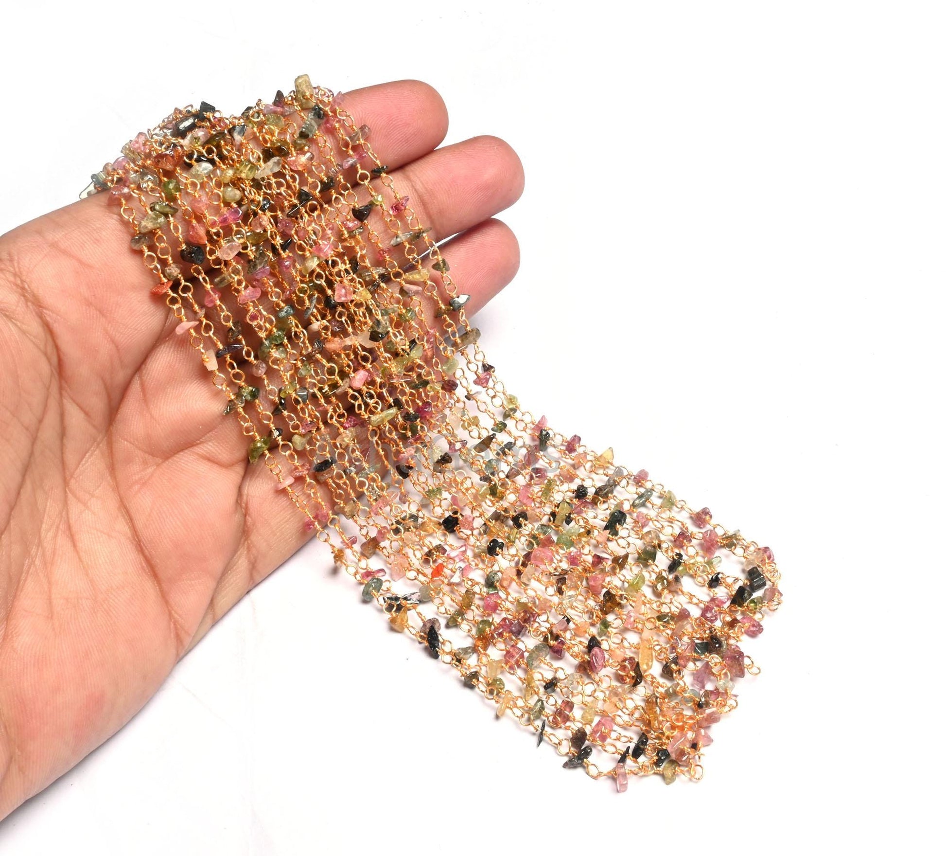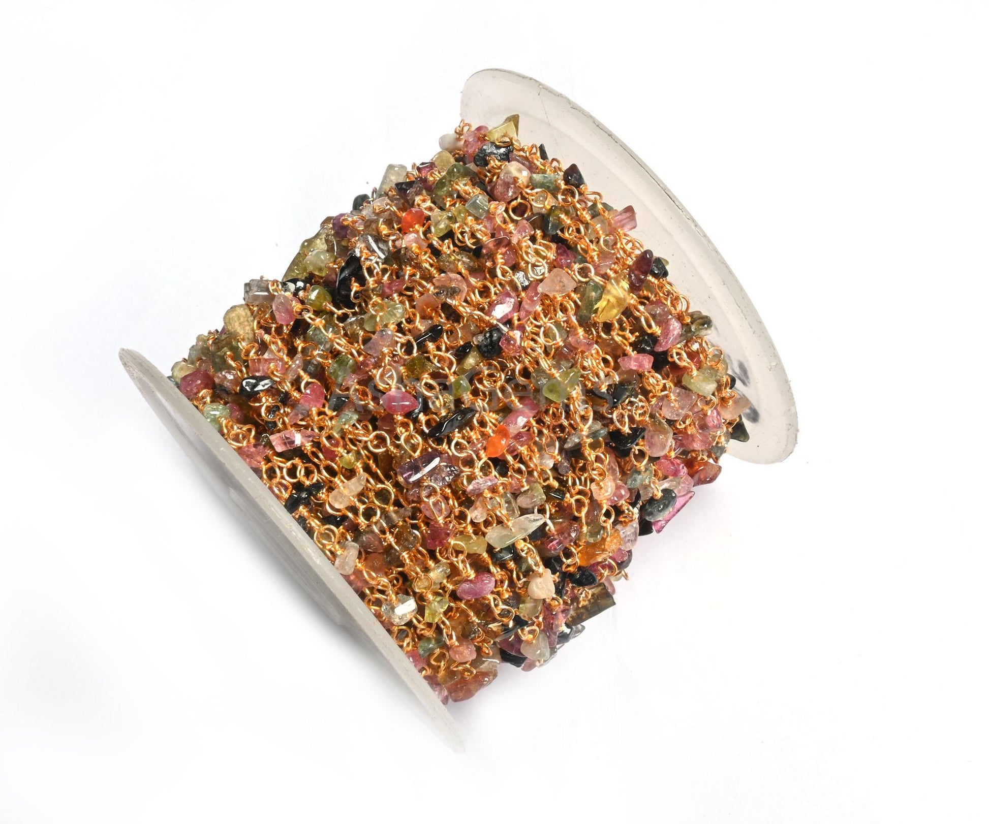 Beautiful Multi Tourmaline Uncut chips Chain, Natural Gemstone Uncut beads rosary chain Gold Plated wire Beaded Chain by Foot, Jewelry Craft