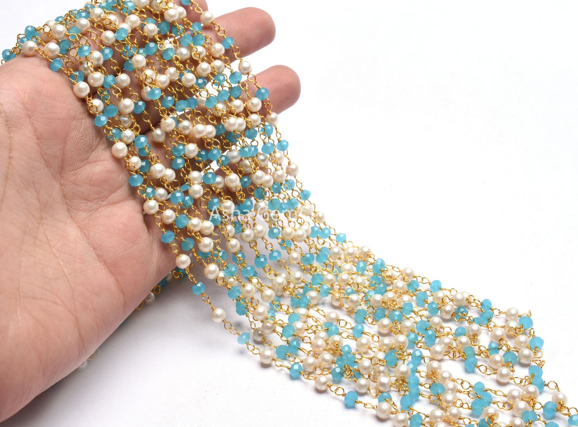 Beautiful Pearl, Blue Chalcedony Hydro Beads Rosary Chain,4 mm Multi Color Rondelle Gold Plated Wire Wrap Bulk Handmade Chain Jewelry Making