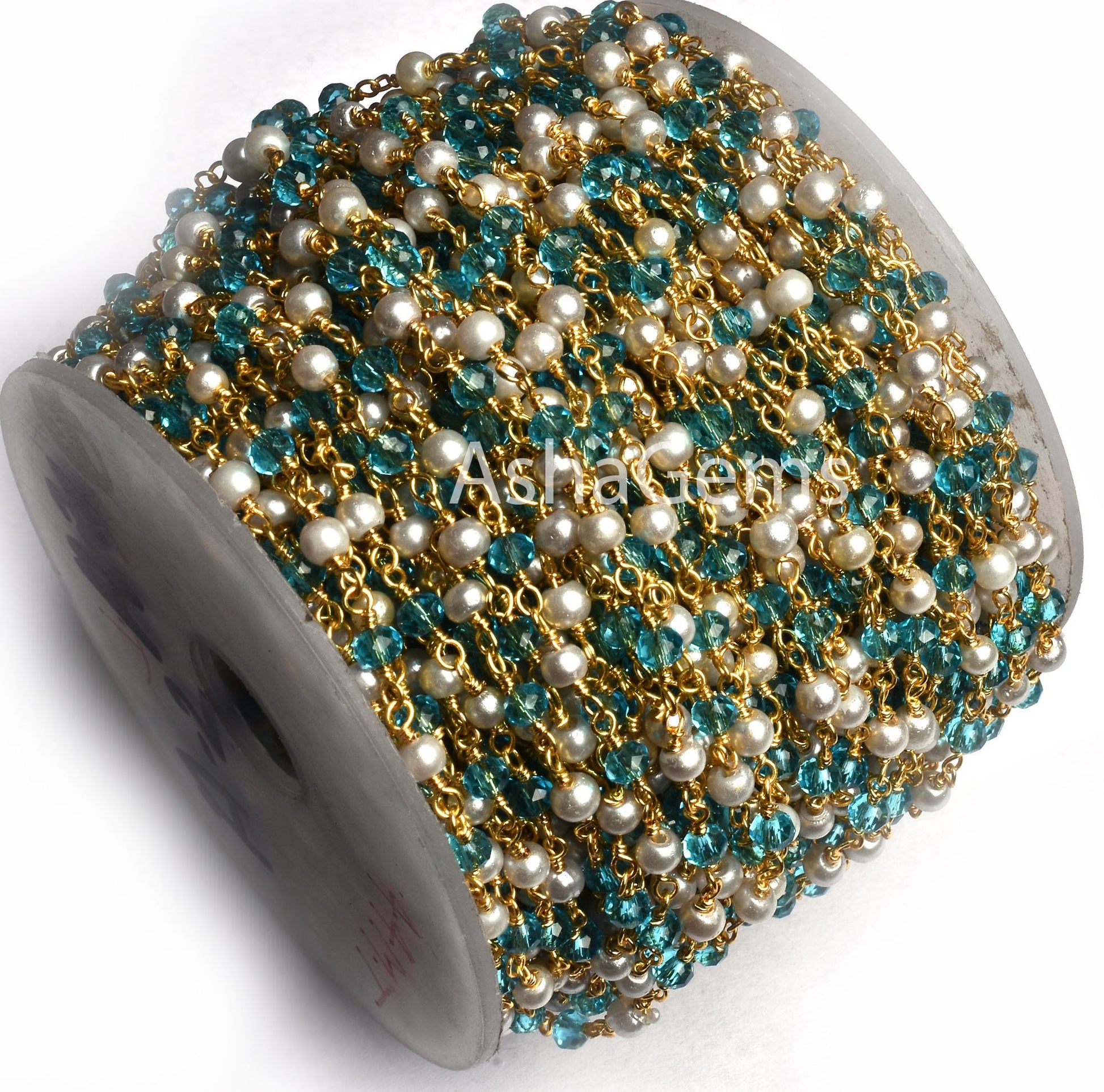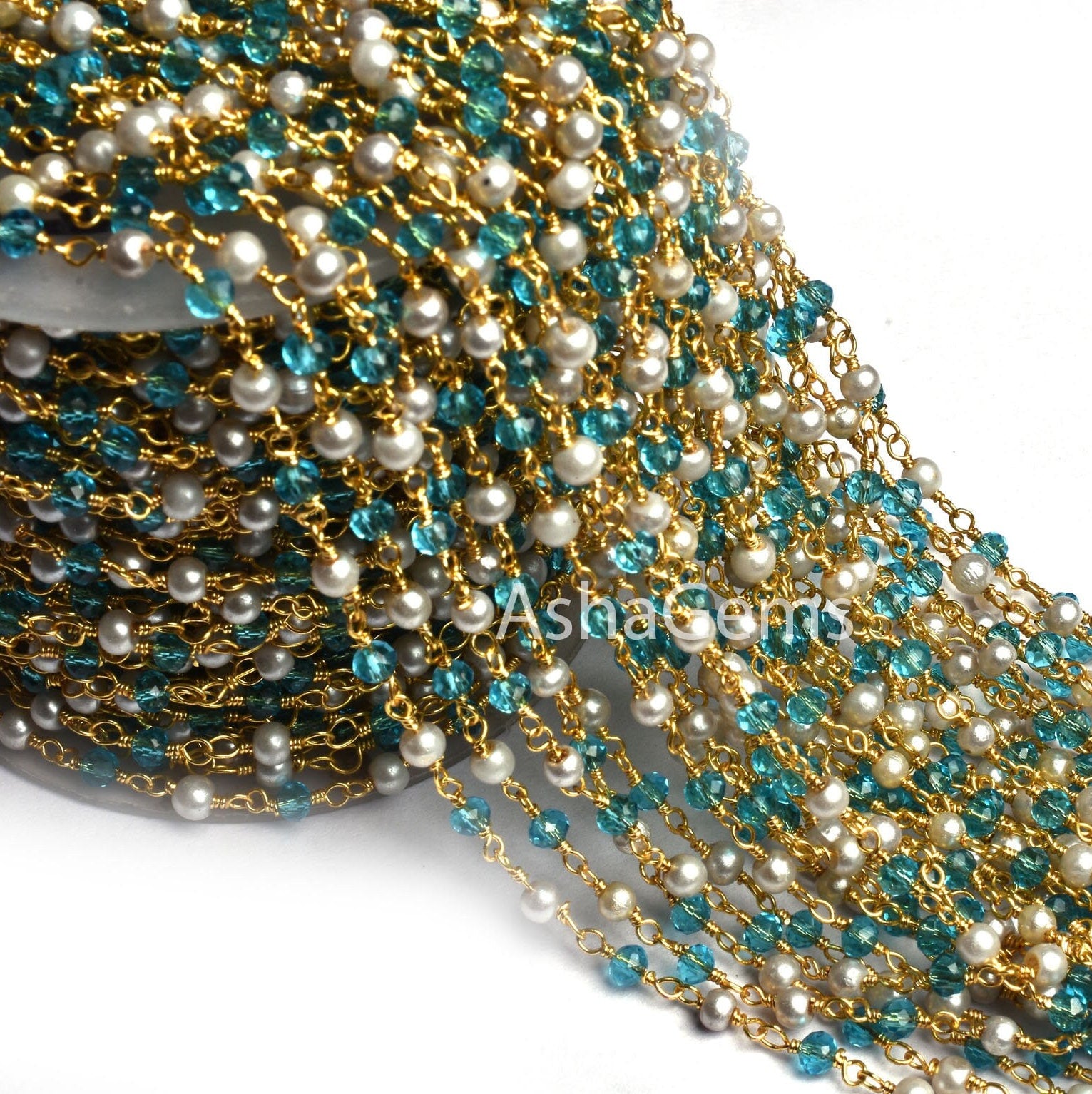 Beautiful White Pearl, Blue Topaz Hydro Beads Rosary Chain Gold Plated Wire Wrap Rondelle Beaded Chain 3 mm Jewelry Making handicraft Chain