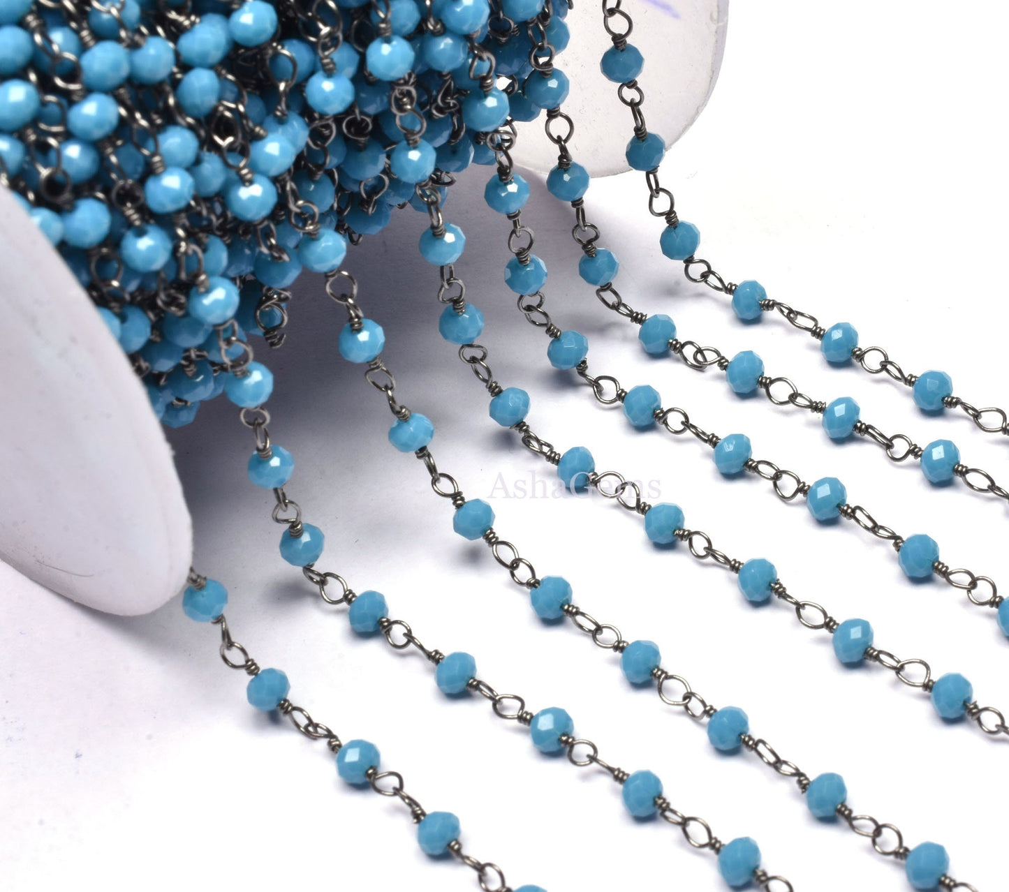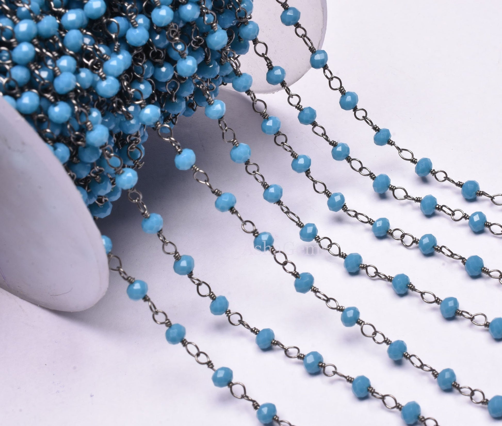 Chain Beautiful Blue Turquoise Hydro Rondelle Faceted Beads Rosary Chain,3 mm Black Plated Gunmetal Wire Jewelry Making Bulk Roll Chain Bead