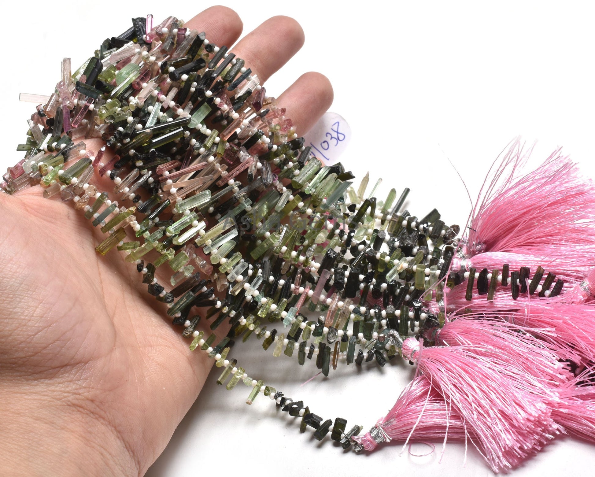 Fine Multi Pink Green Tourmaline Pencil Shape Uneven Gemstone Beads, Real Tourmaline Smooth Raw Long Stick Rough fancy Side Drill Bead Craft