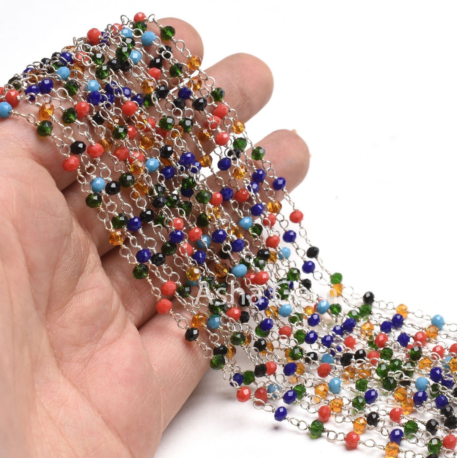 Multi Disco Hydro Beads Rosary Chain Silver Plated Wire Wrap Chain Roll,3mm Mix Color Beaded Faceted Rondelle Chain By Feet Jewelry Necklace