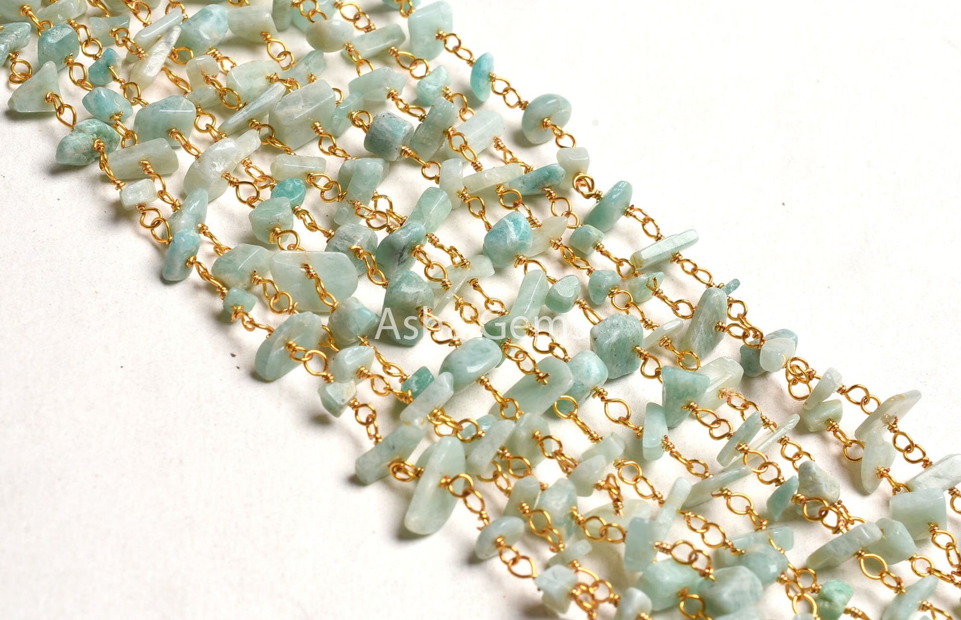 Natural Amazonite Uncut Chip Beads Rosary Chain By Foot Gold Plated Wire Wrap Nuggets Beaded handmade Chain Jewelry Necklace Making Crafts