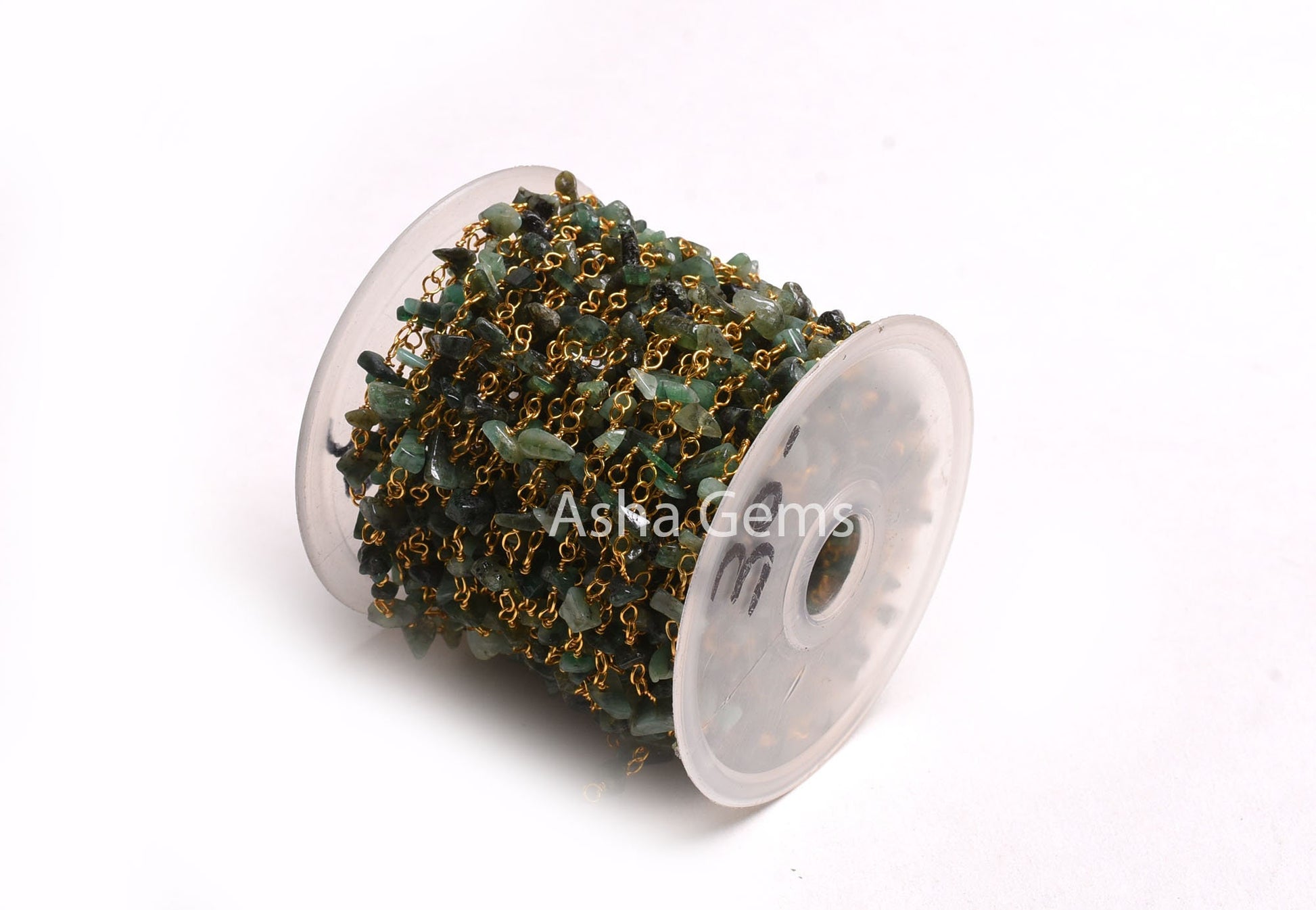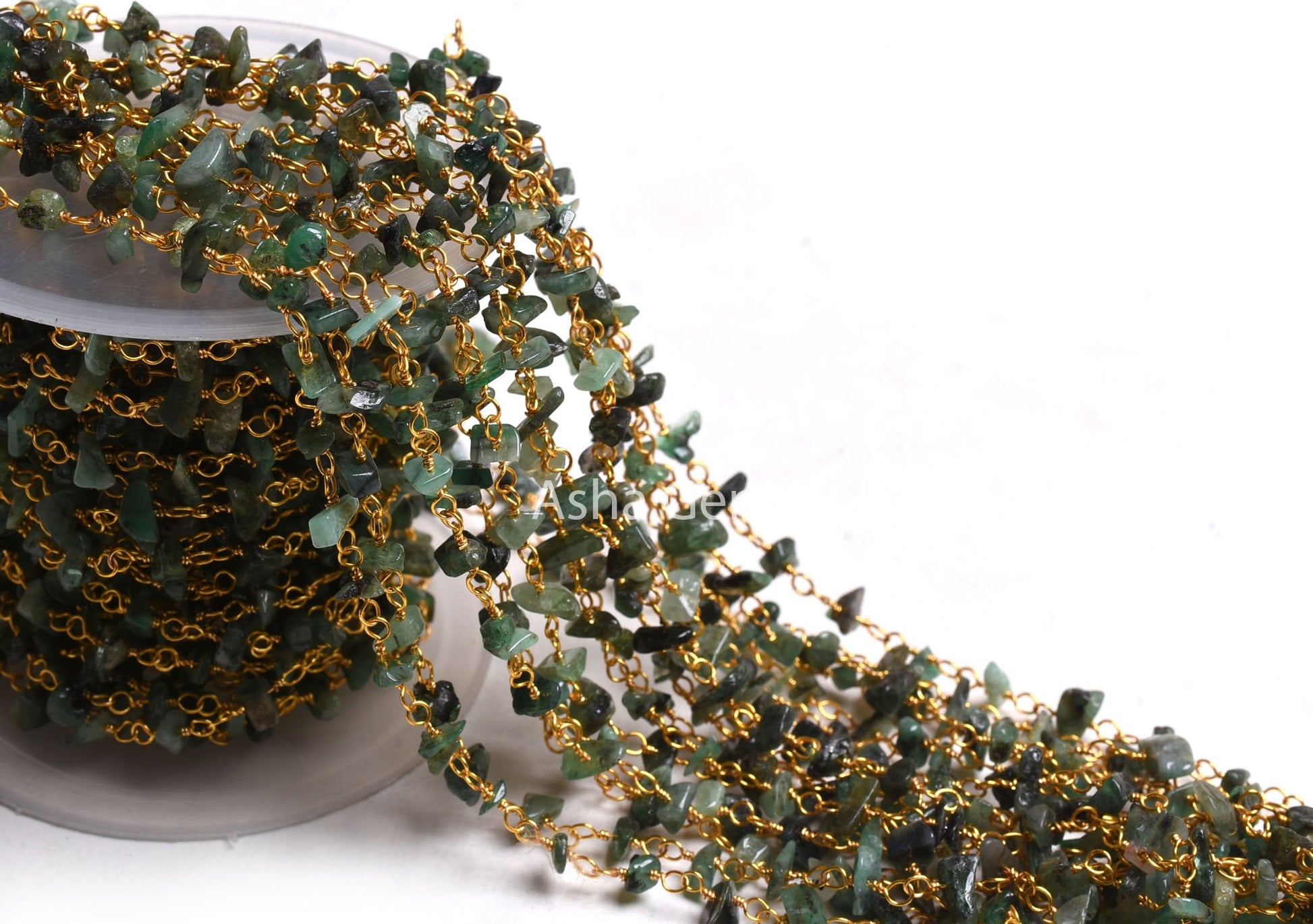 Natural Green Emerald Gemstone Uncut Chip Beads Rosary Chain Gold Plated Wire Wrap Emerald Beaded Uneven Nugget Chain Jewelry Necklace Craft