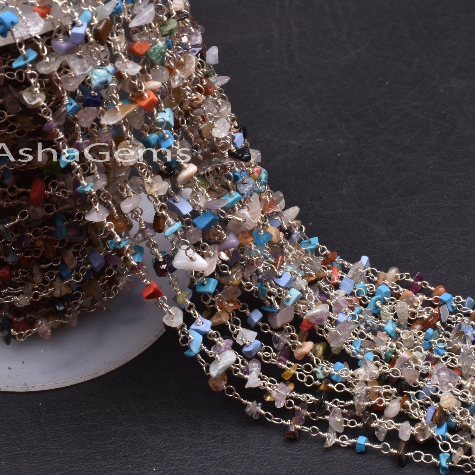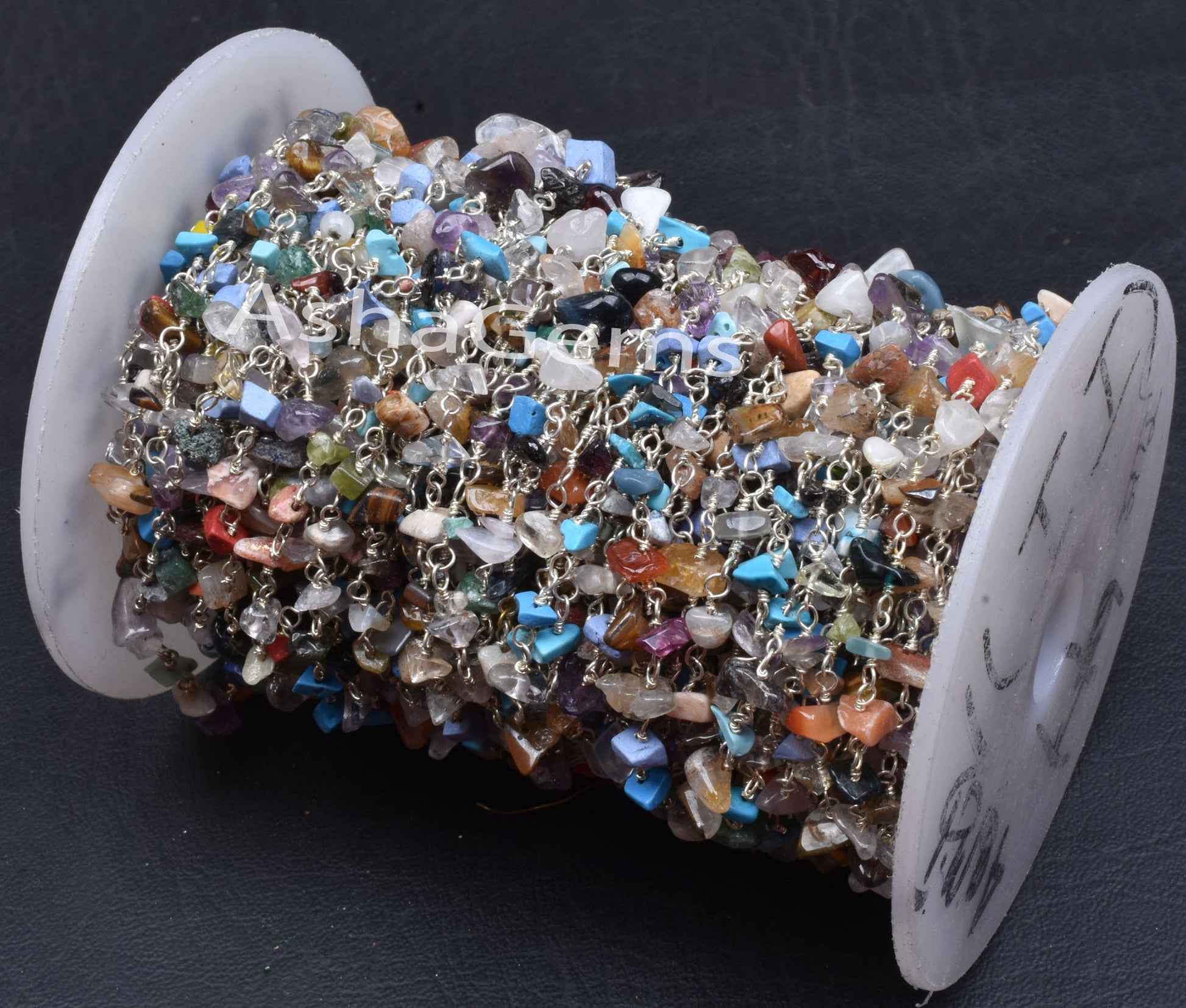 Natural Multi Disco Uncut Chips Rosary Chain silver Plated Wire Bulk Roll, multi Color Gemstone Beads Chain Beaded Rosary Chain By Foot SALE