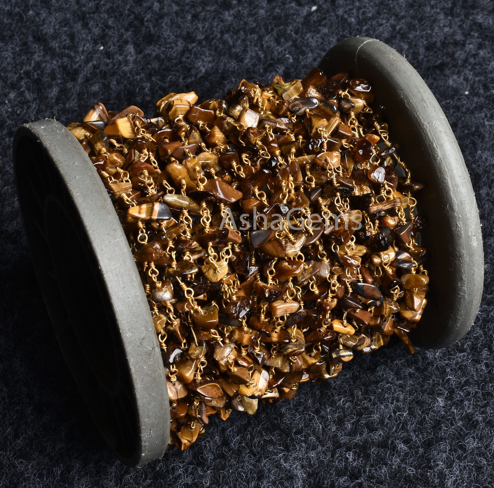 Natural Tiger Eye Uncut Chip Beads Rosary Chain Gold Plated Wire Wrap Handmade Chip Beaded Gemstone Nugget Chain for Jewelry Making Necklace