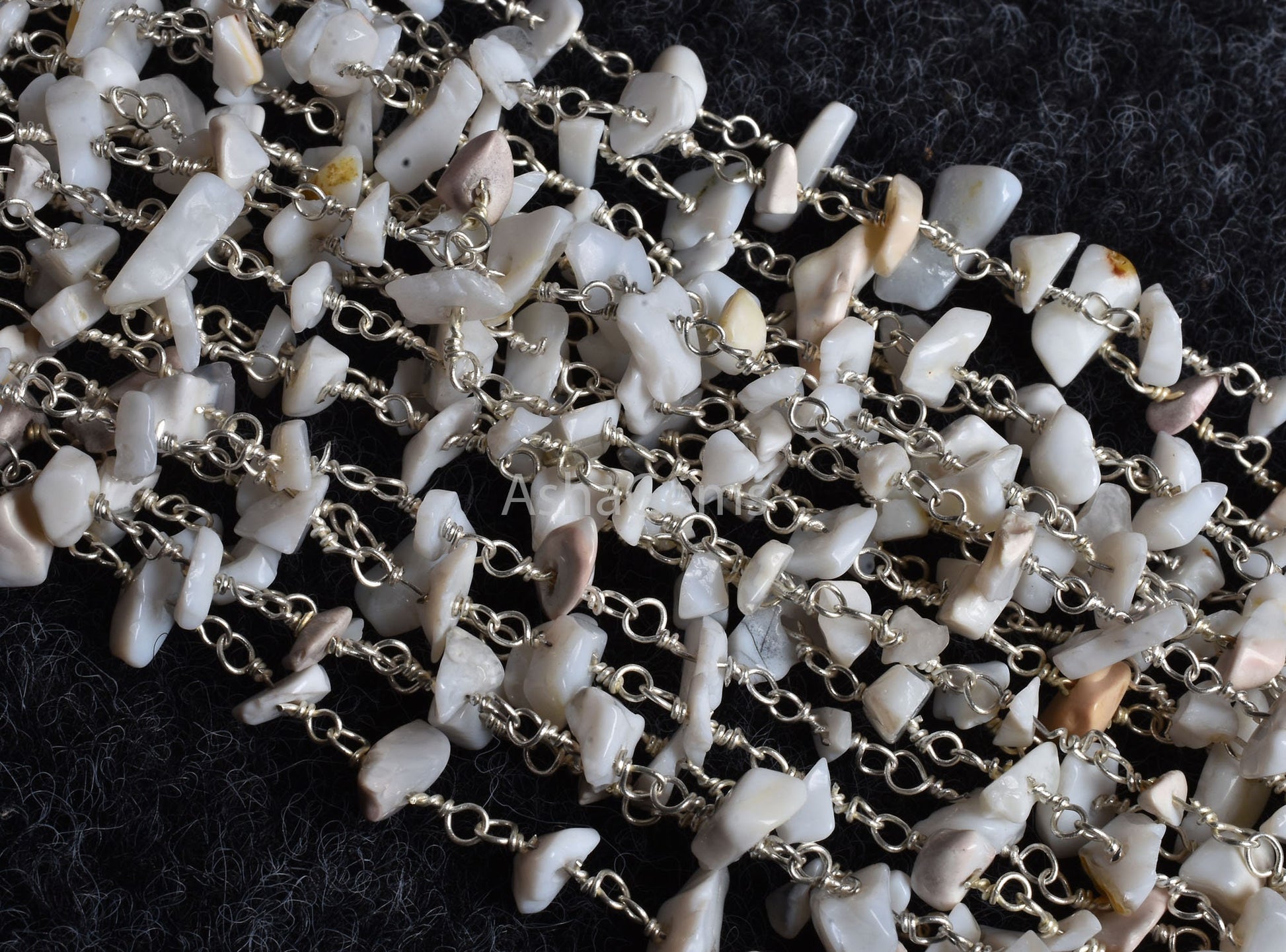 Natural White Opal Uncut Chip Beads Rosary Chain Silver Plated Wire Bulk roll Beaded Chain Gemstone Opal Smooth Nugget Chain Jewelry Crafts