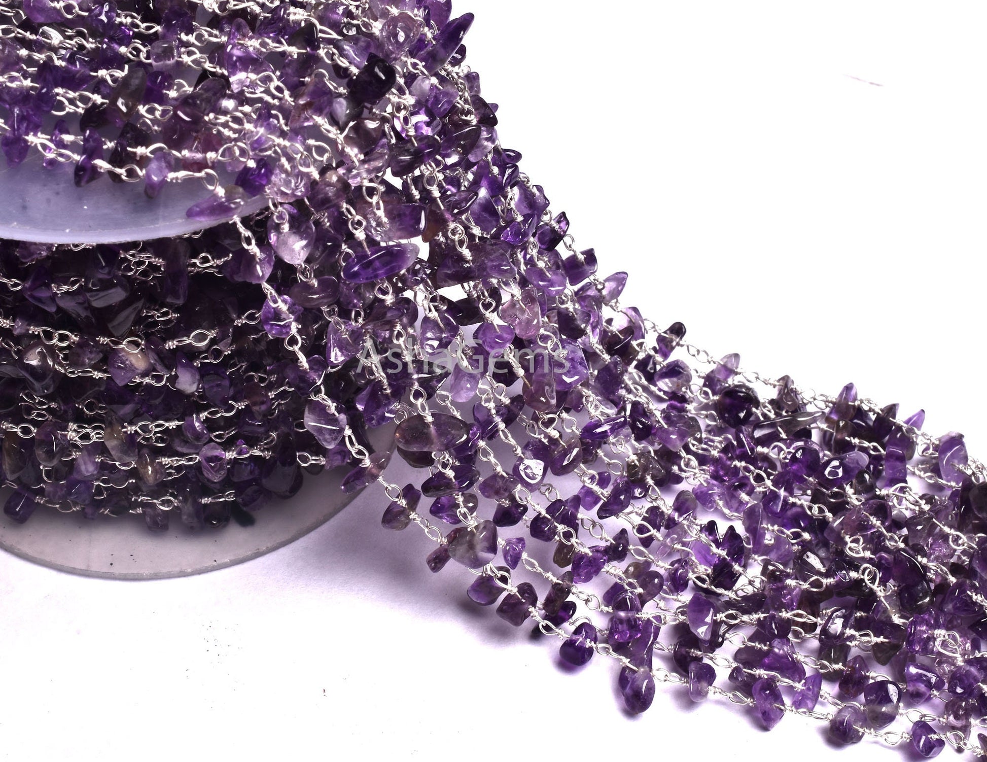 Nugget Rosary Chain,3,5,10 By Feet,Natural Purple African Amethyst Uncut Chips Beaded Rosary Chain,Gold,Silver Plated Wire,Chain,Bulk Roll