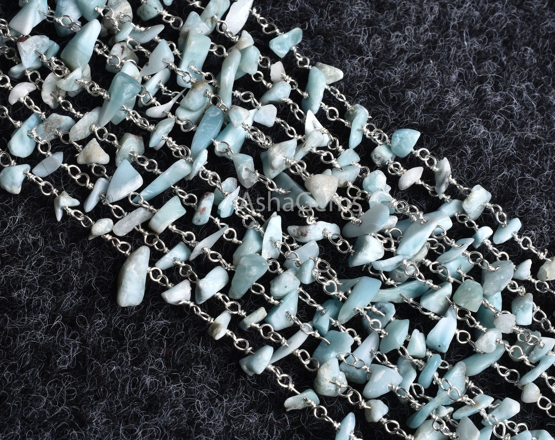 Rare Blue Larimar Beads Rosary Chain, Uncut Chip Chain Smooth Nugget Beaded Rosary Chain, Silver Chain Wire, Finding, Wholesale Rosary Chain