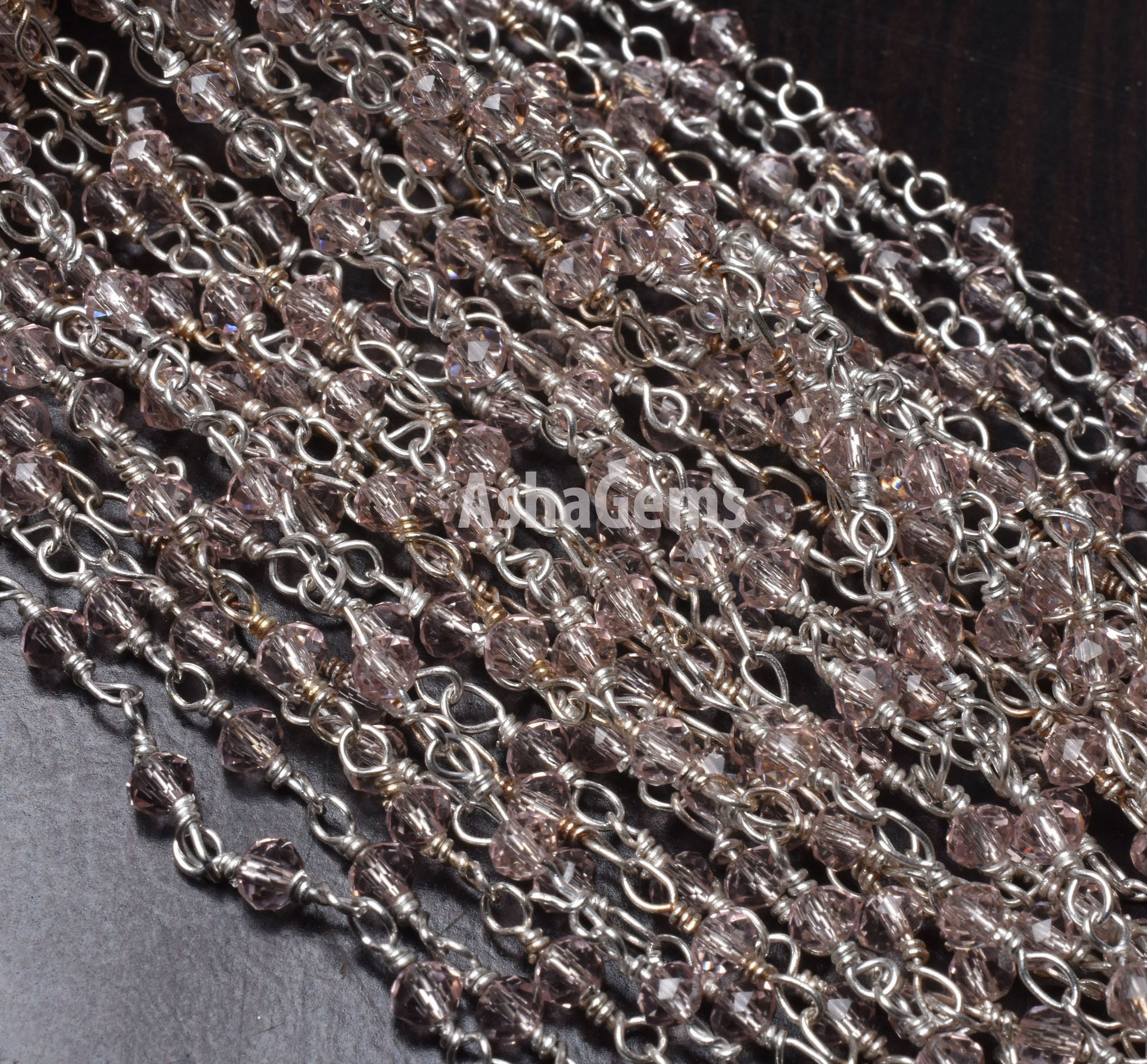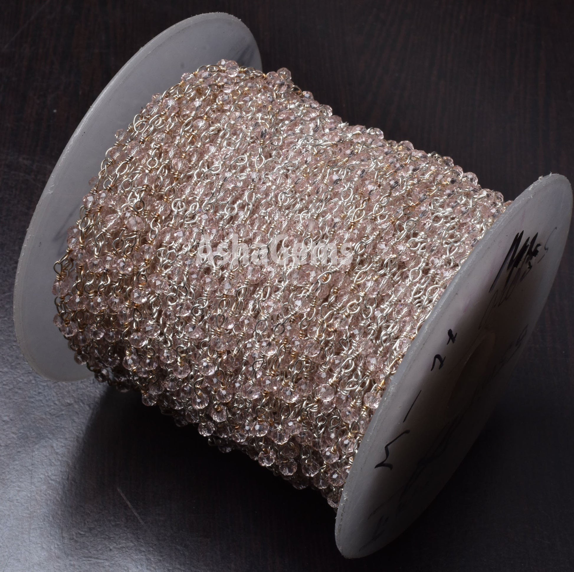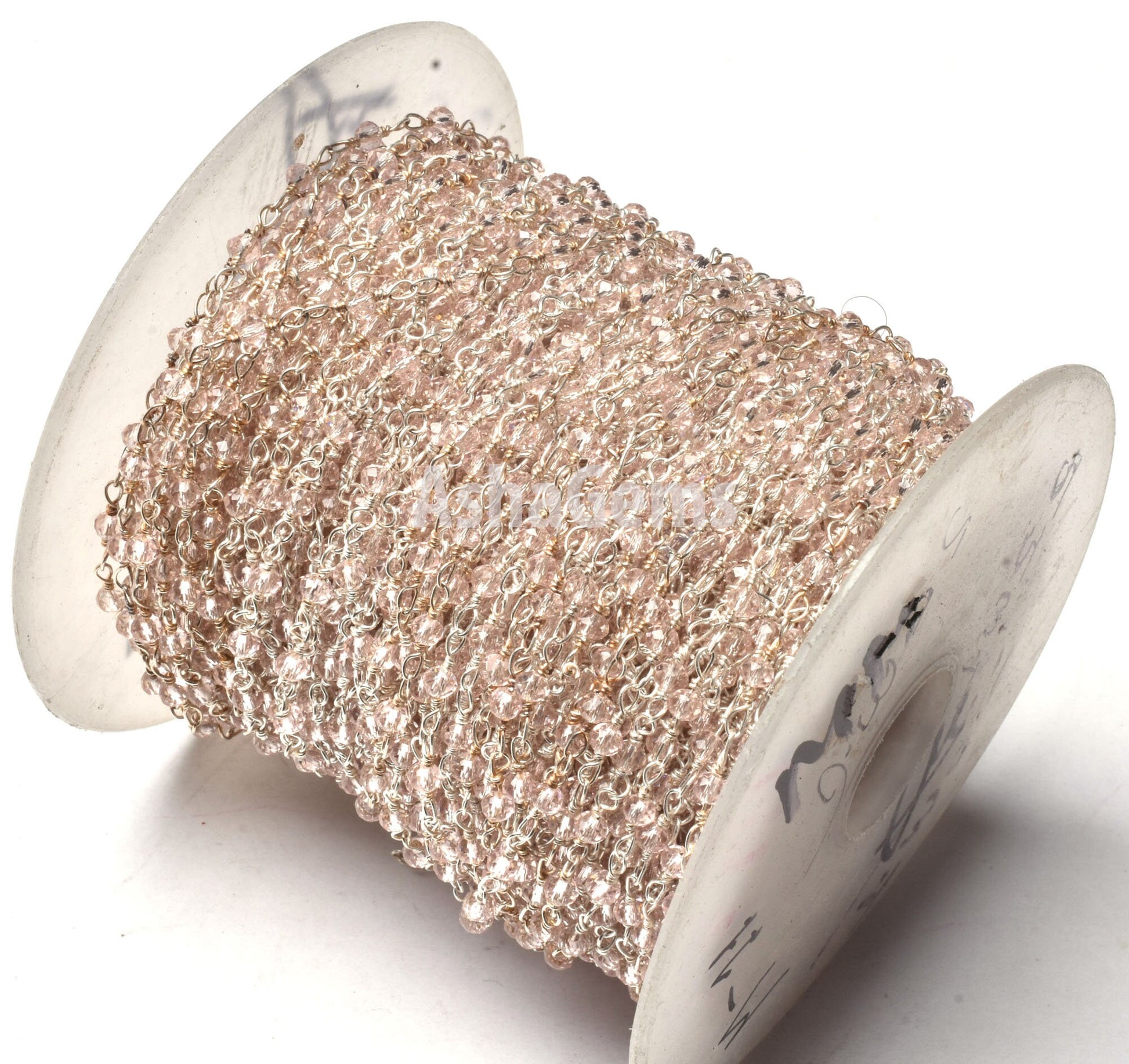 Rosary Chain Silver Plated Wire 3,5,10,25 Ft Light Pink Quartz Hydro Faceted Rondelle Beaded Jewelry Finding Wire Wrapped Chain 3-3.5mm SALE