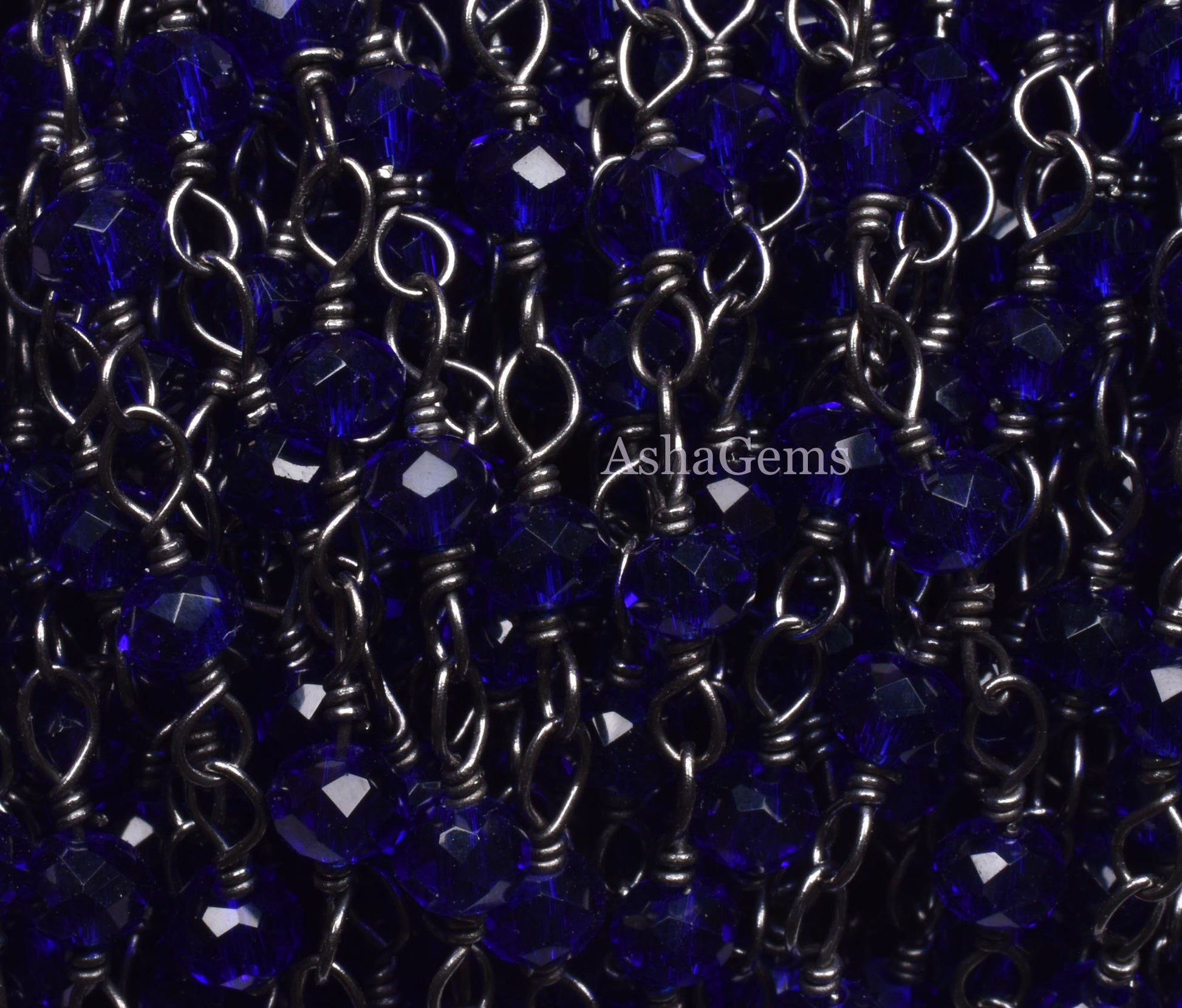 Royal Blue Quartz Hydro Faceted Beads Chain 1-50 Feet Black Metal Plated Wire Chain, 3-3.5 mm Gunmetal Jewelry Making Rosary Chain