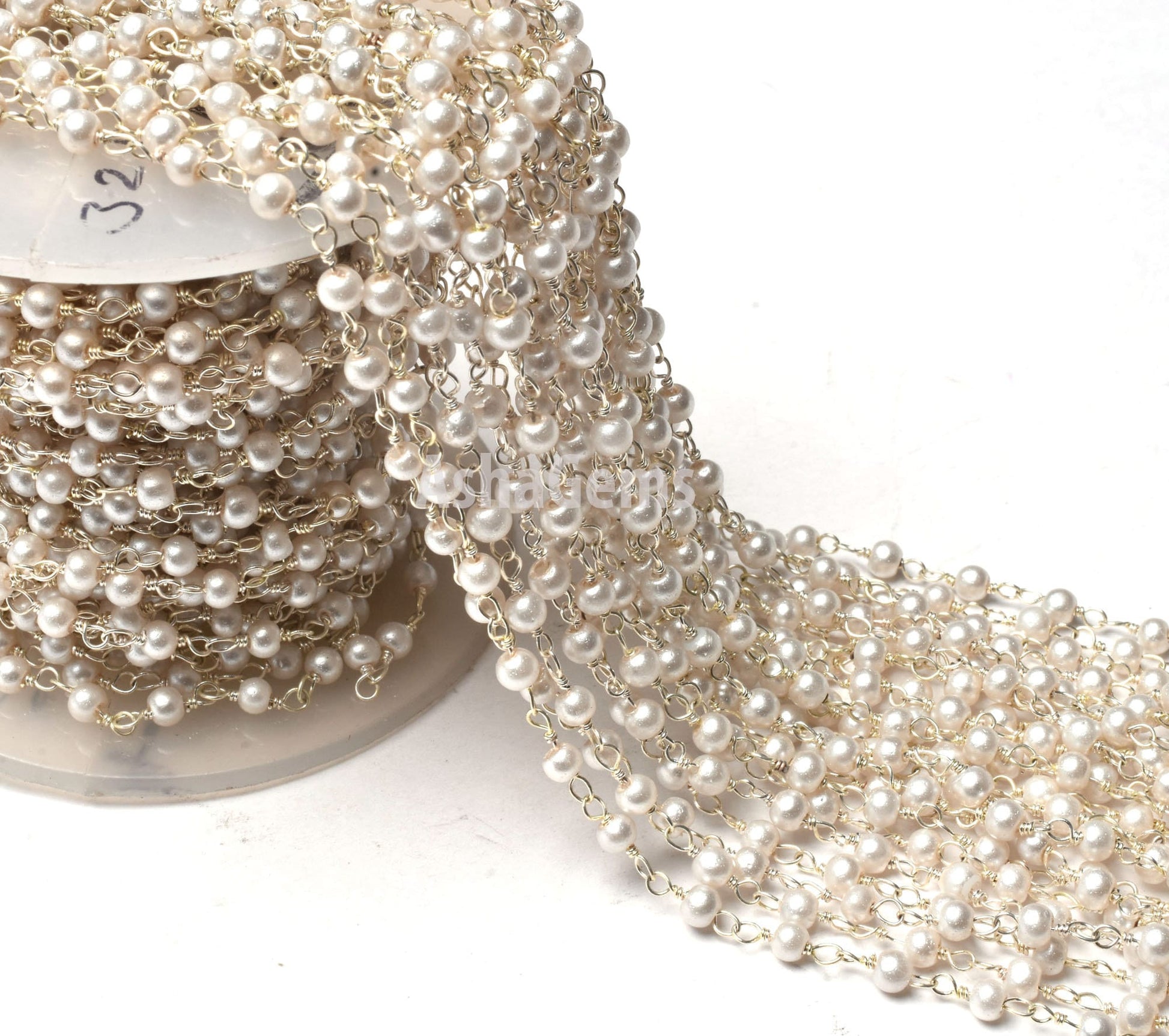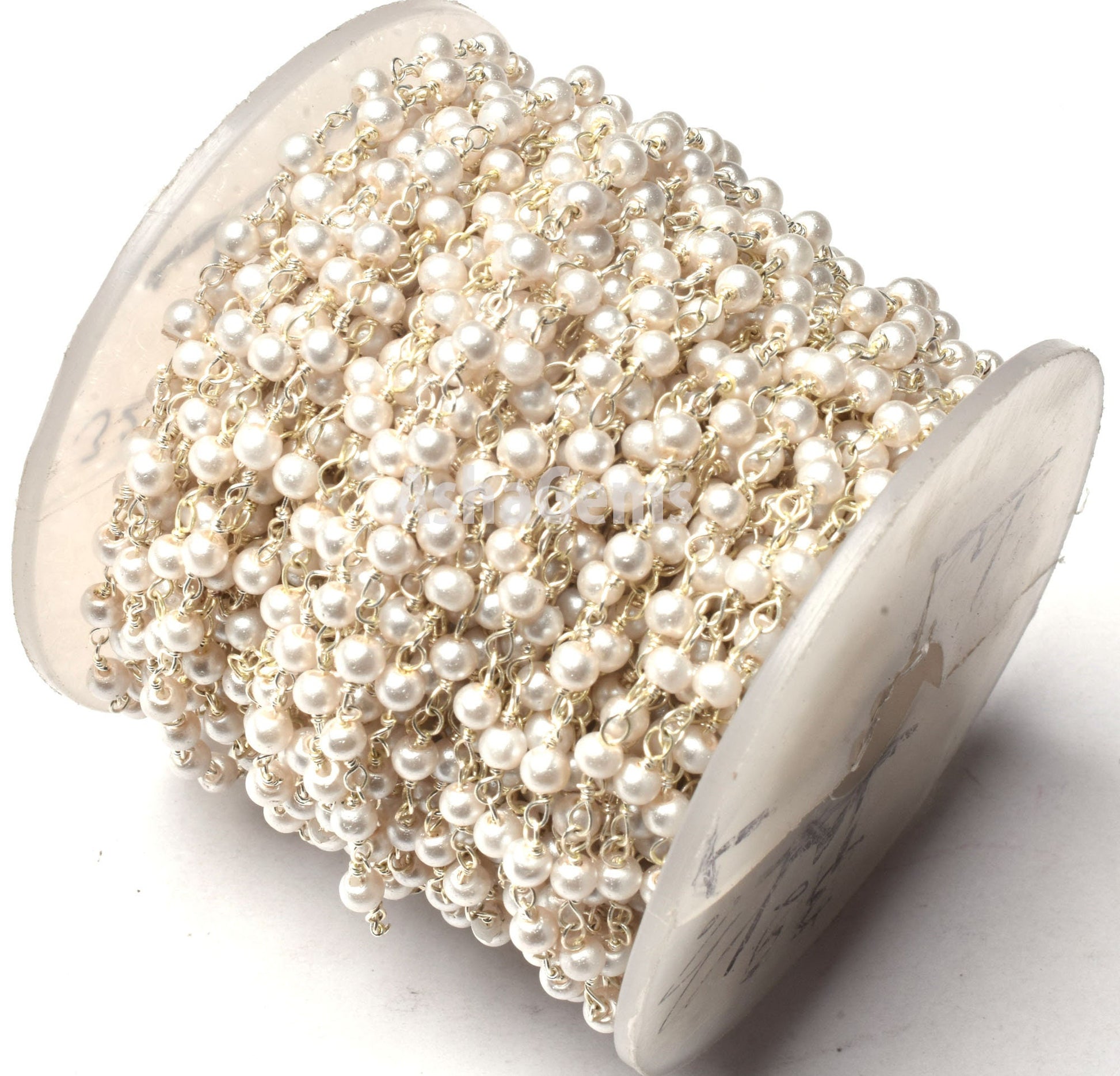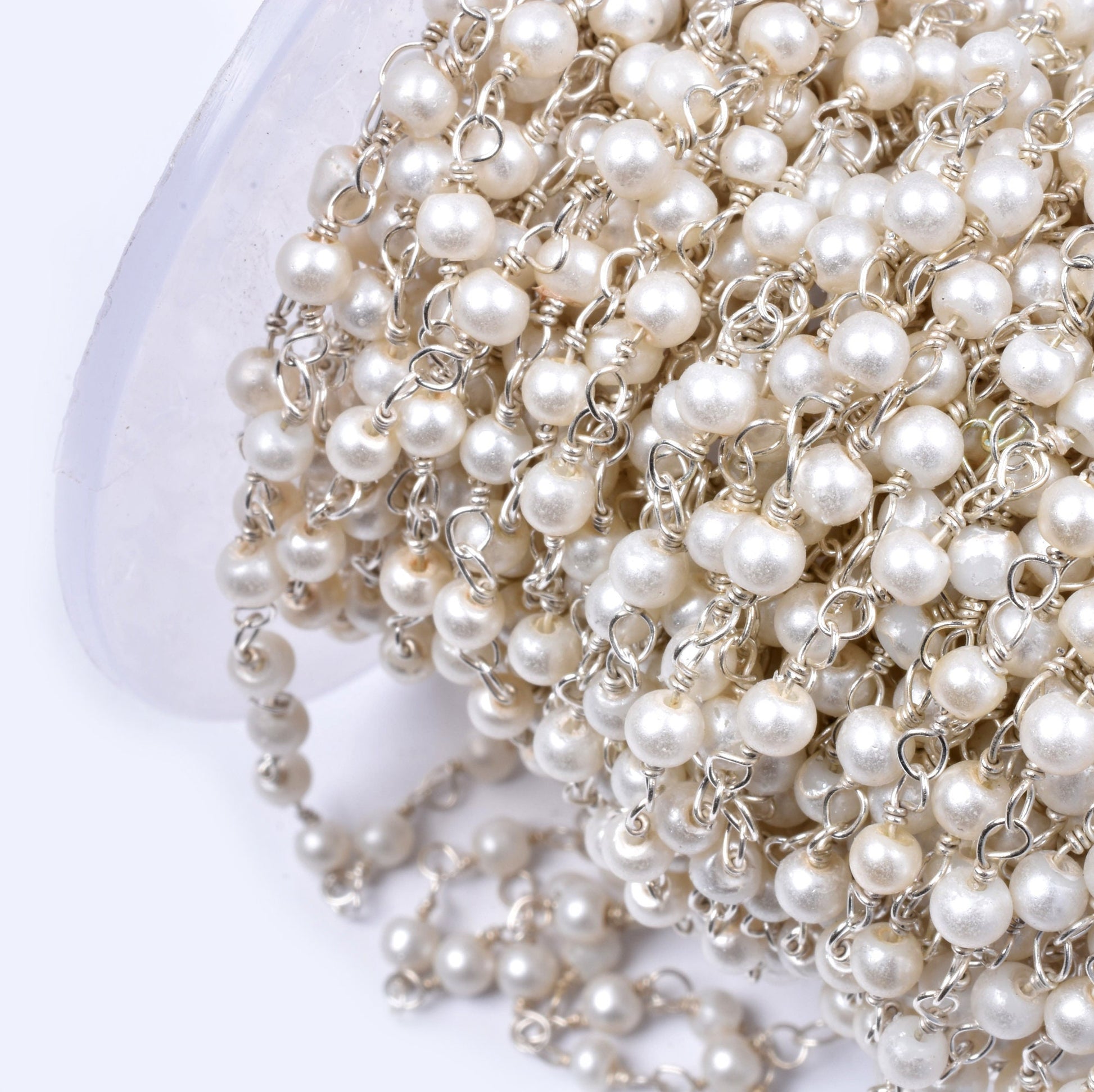 SALE 3,5,10,25 Ft White Pearl Hydro Faceted Rondelle Beaded Rosary Chain Silver Plated Wire,Jewelry Making Finding,Wire Wrapped Chain 3-3.5
