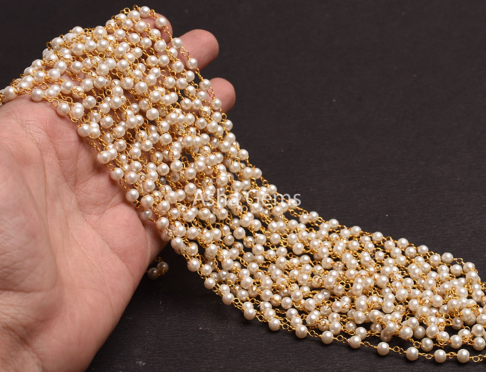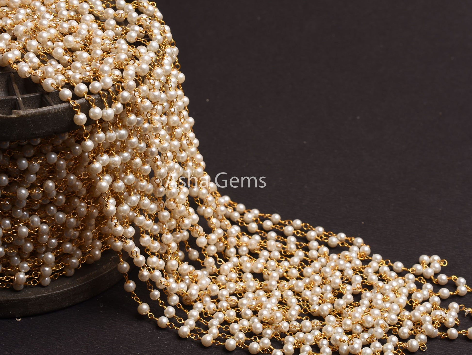 SALE 3,5,10,25Ft White Pearl Hydro smooth Rondelle Beaded Rosary Chain gold Plated Wire Jewelry Making Finding,4mm Bead Wire Wrapped Chain