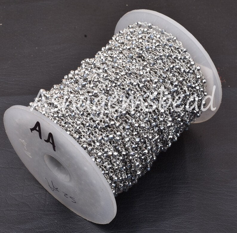 SALE 3,5,10 Feet,Silver Pyrite Hydro Faceted Rondelle Beaded Rosary Chain Silver Plated,Jewelry Making, Finding,Wire Wrapped Chain,3-3.5 mm