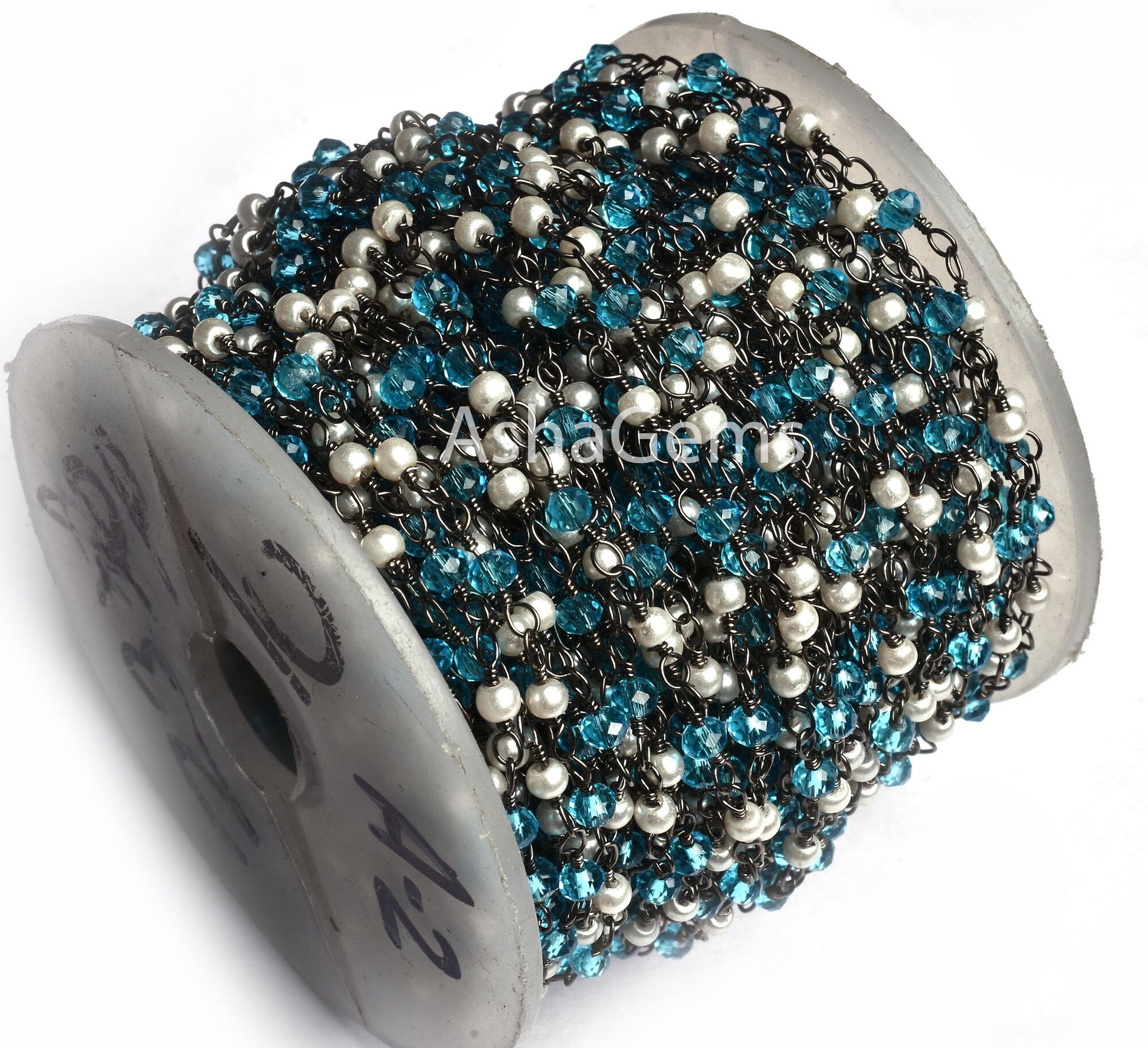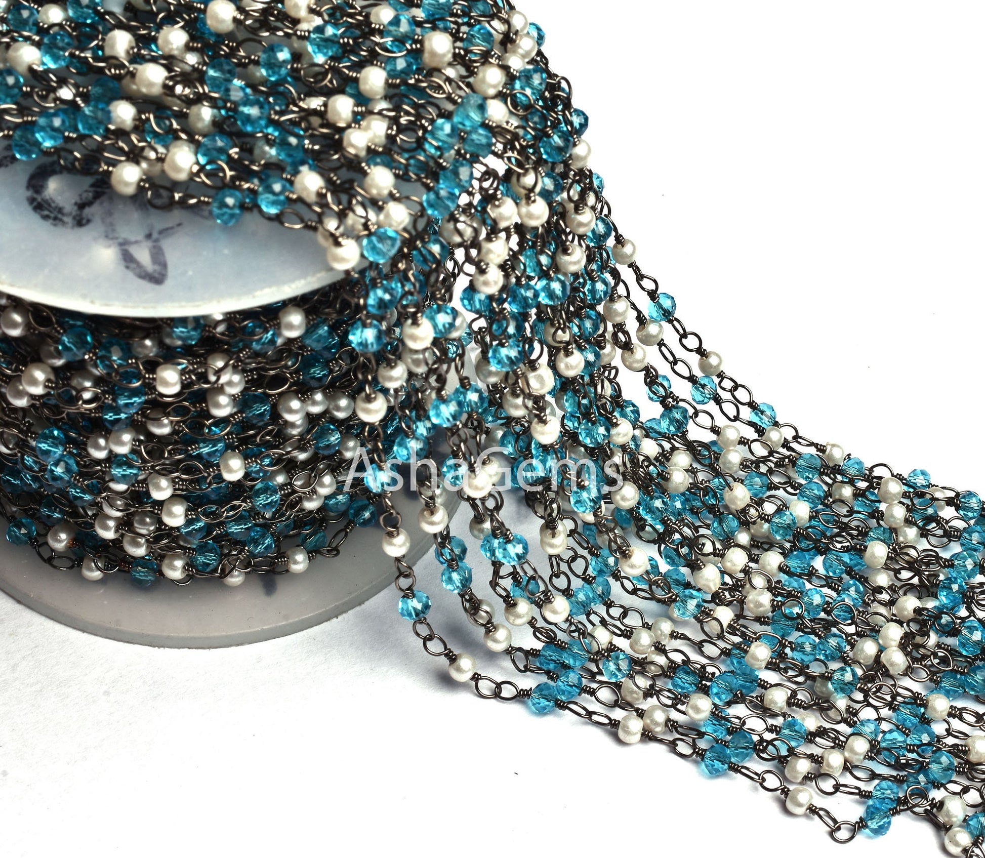 White Pearl, Blue Topaz Hydro Beads Rosary Chain Black Plated Wire Wrap Chain Faceted Rondelle Beaded Chain Jewelry Making Finding Chain DIY