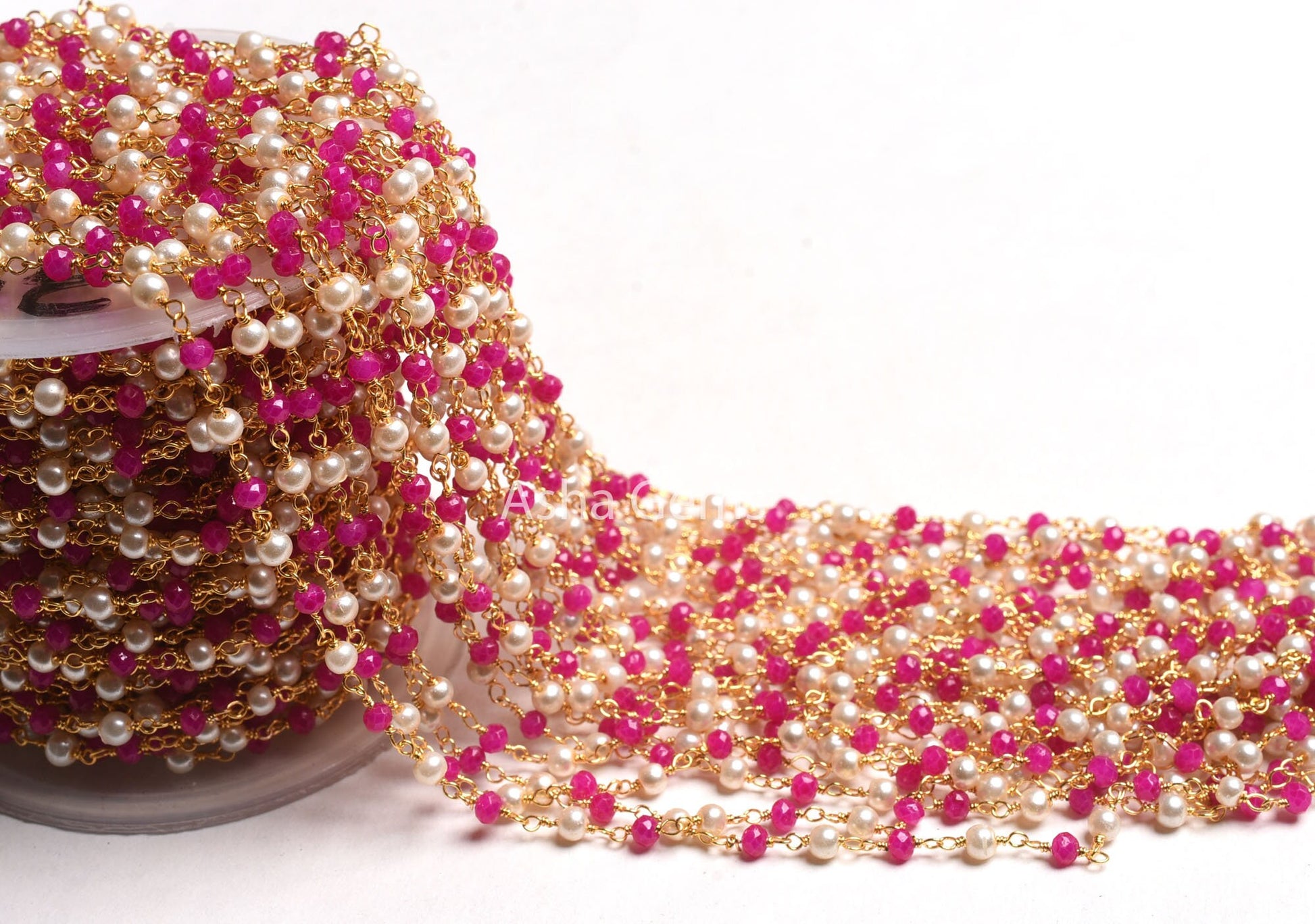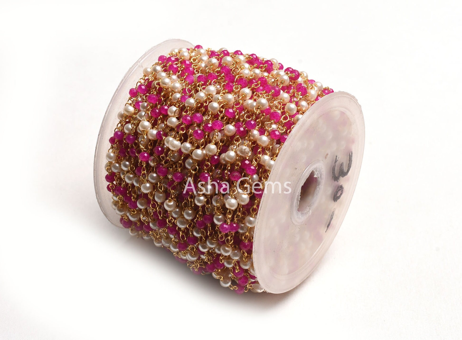 White Pearl Pink Chalcedony Hydro Beads Rosary Chain, Faceted Rondelle Beads 1,10,25 Feet Gold Plated Wire Roll Jewelry Making Finding Chain